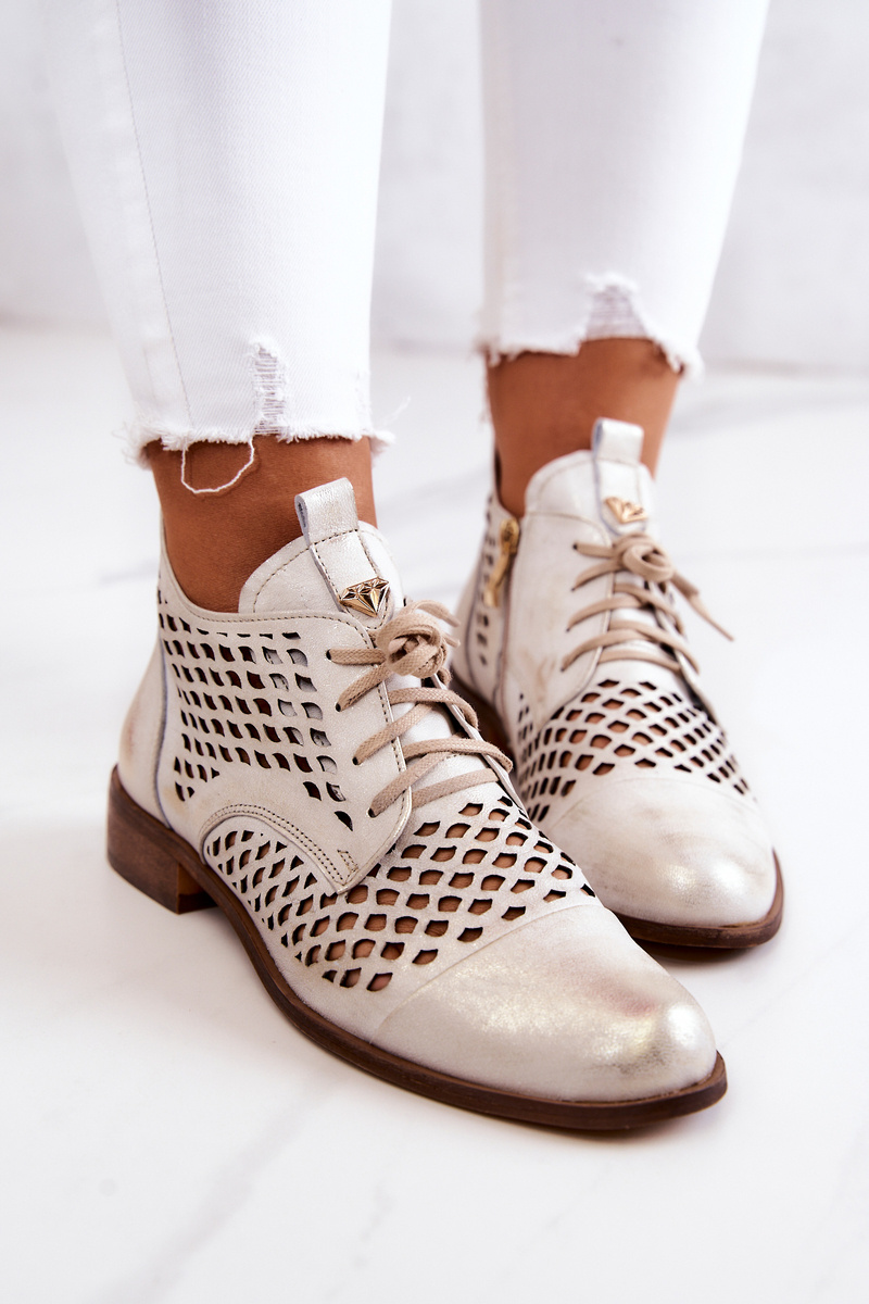 Botki Trzewiki Skórzane Ażurowe Biało-Złote Nicole 2704/004