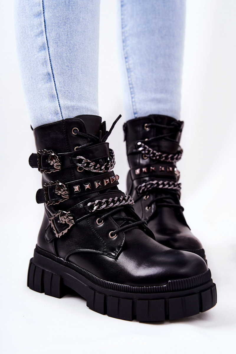 Botki Wiązane Łańcuch Sprzączka Czarne Reiloy