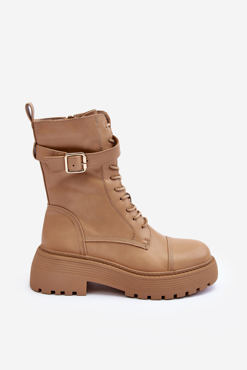 Botki Workery Płaski Obcas Skóra Klamra Beżowe Samivlo JJ19P