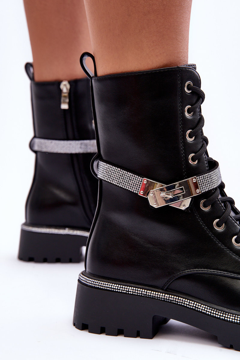 Uwielbianym i najczęściej wybieranym modelem przez kobiety są botki na płaskim, stabilnym obcasie. Posiadają wiele atutów, jednak głównym z nich jest zapewnienie wysokiego komfortu podczas noszenia. Wykonane ze skóry naturalnej. Osadzone na płaskim obcasie i platformie ze żłobieniami. Botki posiadają sznurowanie oraz suwak z boku cholewki. Ozdobione małymi, błyszczącymi dżetami. Ocieplone wewnątrz kocem obuwniczym.