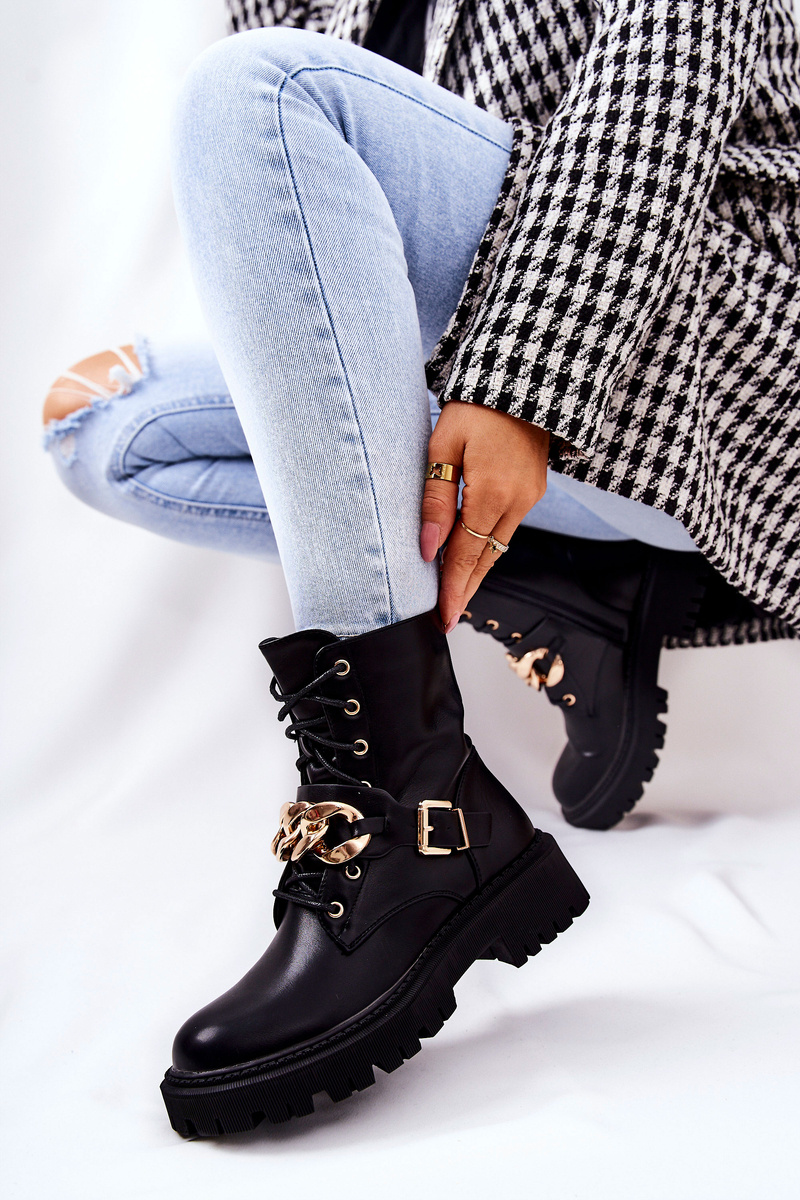 Buty, które są nieodłącznym elementem jesienno-zimowych stylizacji. Botki w całości zostały wykonane ze skóry ekologicznej. Gruba podeszwa oraz złoty ozdobny łańcuch sprawiają, że buty prezentują się świetnie. Wnętrze buta nie posiada ocieplenia. Botki posiadają wiązanie oraz suwak ułatwiający zakładanie. Łańcuch zapinany na regulowaną sprzączkę. Przy wyborze rozmiaru prosimy sugerować się tabelą rozmiarów.