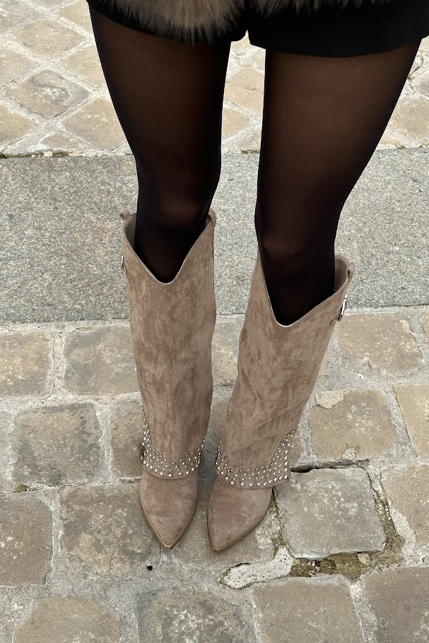 Botki Z Dżetami I Wywiniętą Cholewką Na Słupku Ciemnobeżowe Iveliri