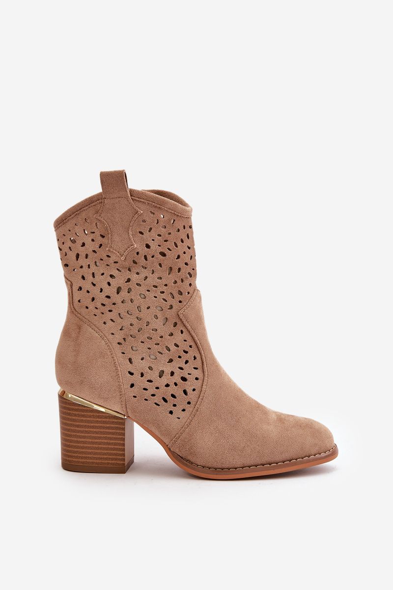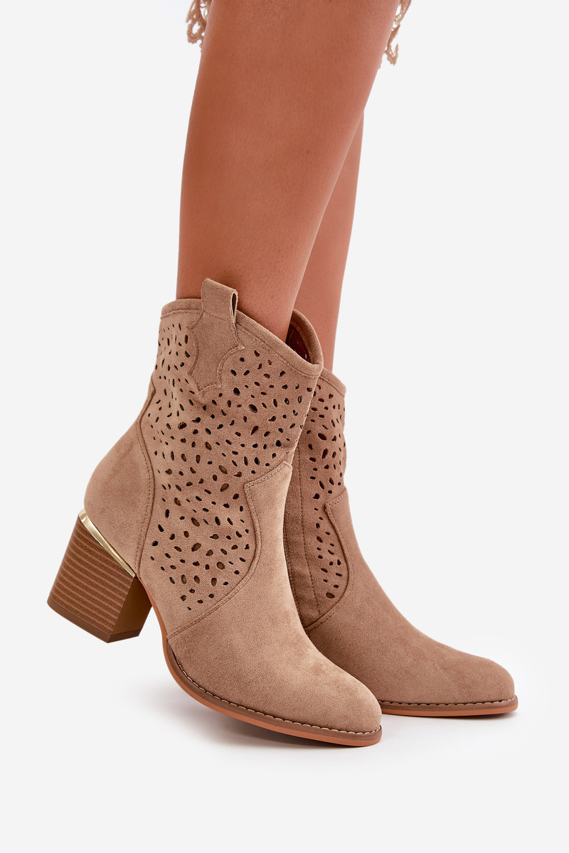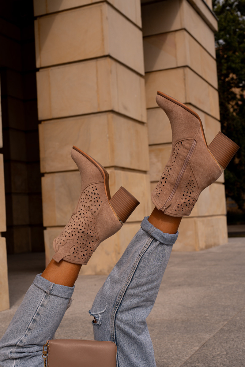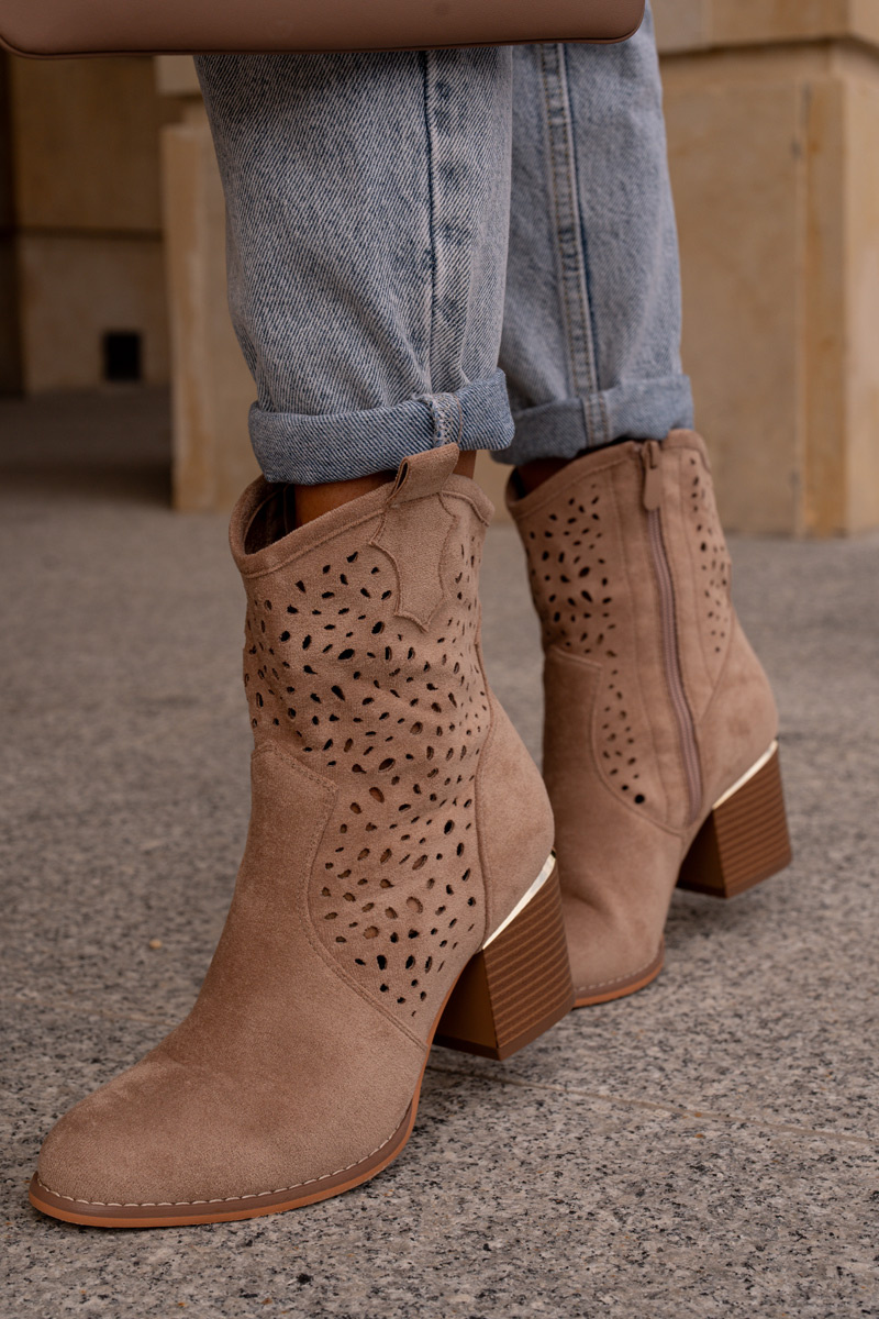 Botki Z Eko Zamszu Zapinane Na Zamek Ażurowe Na Słupku Ciemnobeżowe Sevana