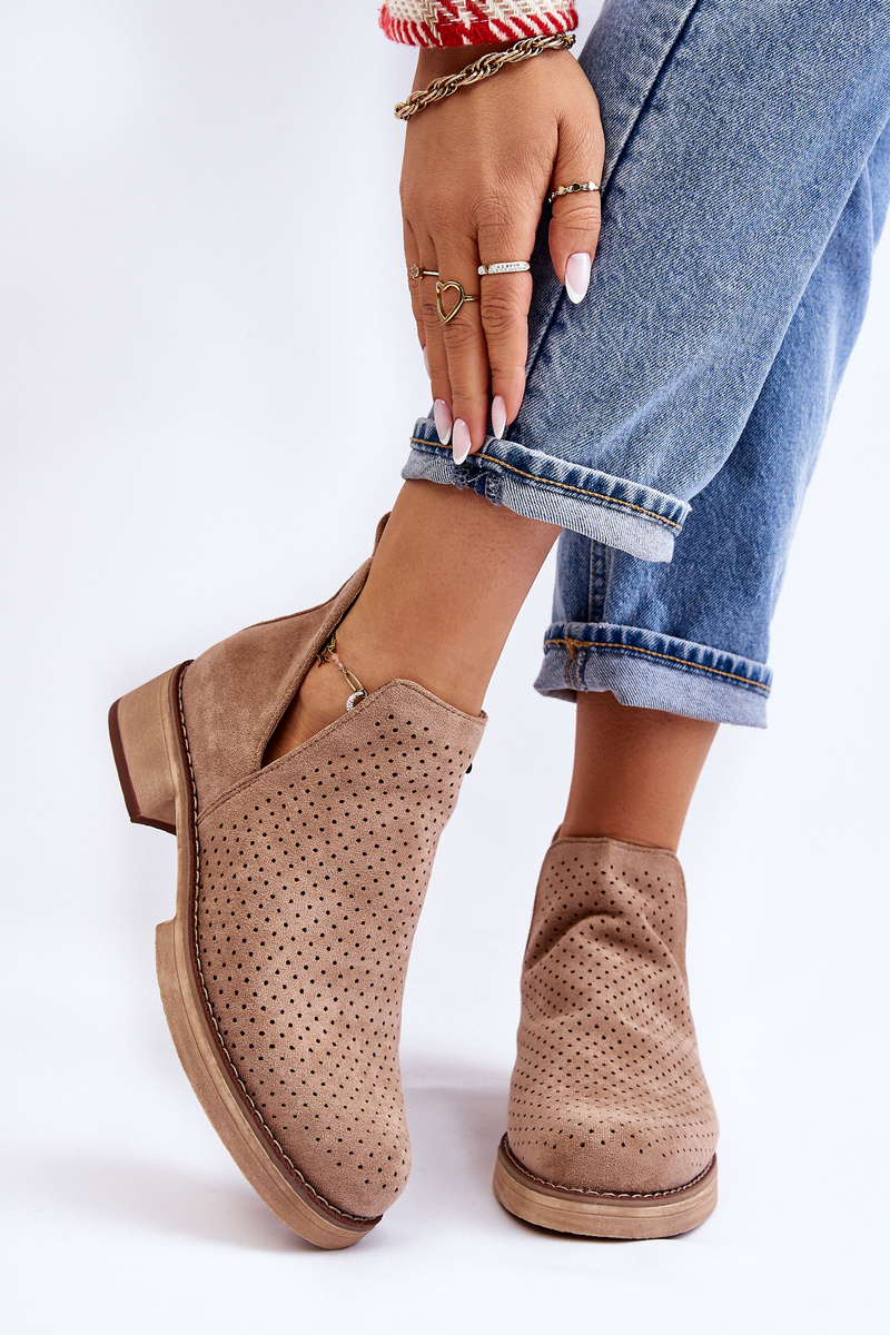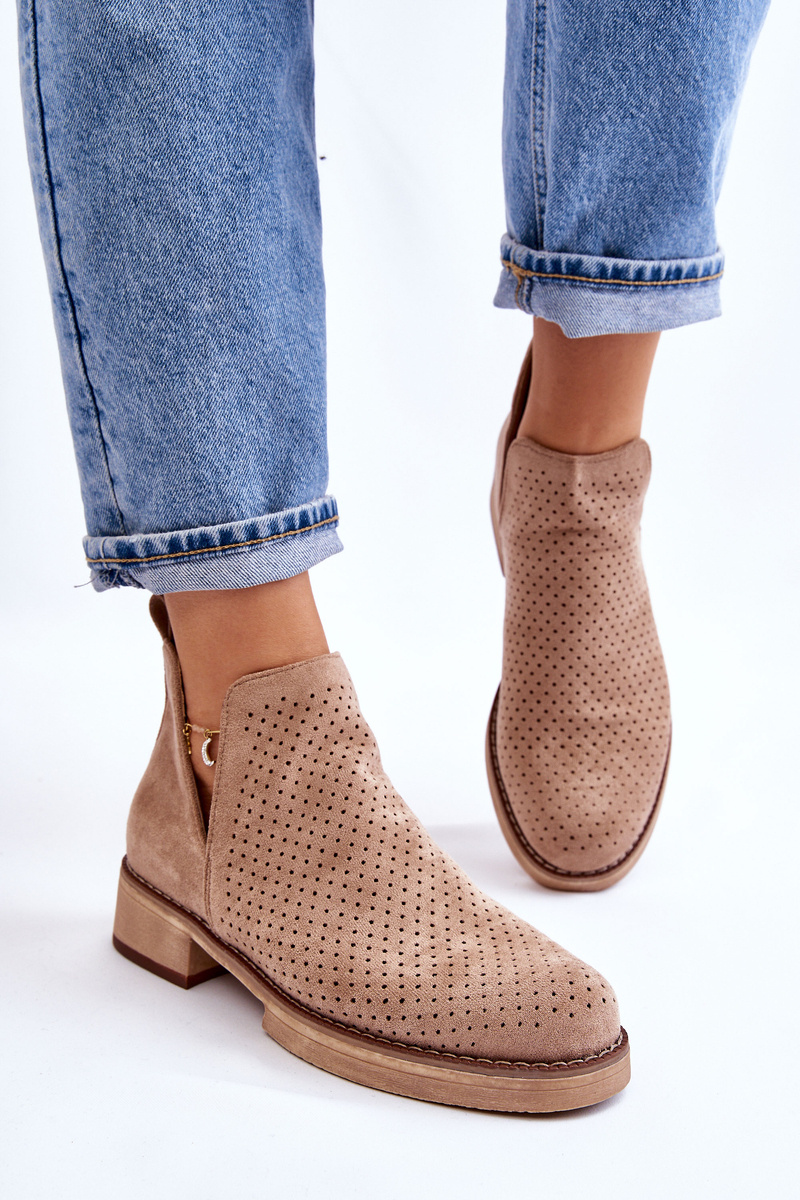 Botki Zamsz Ażur Płaski Obcas Ciemnobeżowe Angie