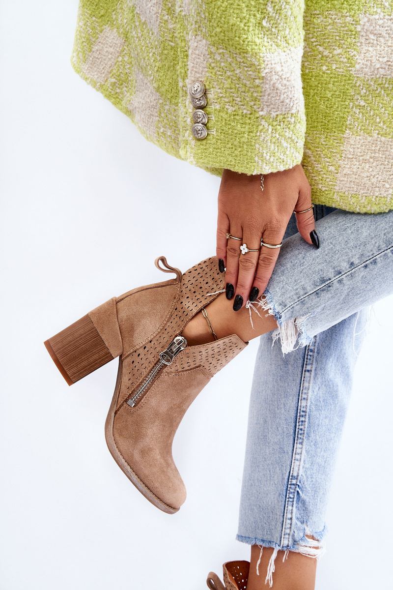 Wiosenne botki stanowią świetne dopełnienie zarówno eleganckich, jak i sportowych stylizacji. Możesz założyć je do dzianinowej sukienki, ale także do jeansów. Wyjątkowy model wzbogaci Twój wiosenny outfit! Wykonane z eko zamszu w ażurowy wzór. Dodatkowo posiadają suwak z boku cholewki. Osadzone na masywnym obcasie w postaci klocka. Wkładka została wykonana z eko skóry.