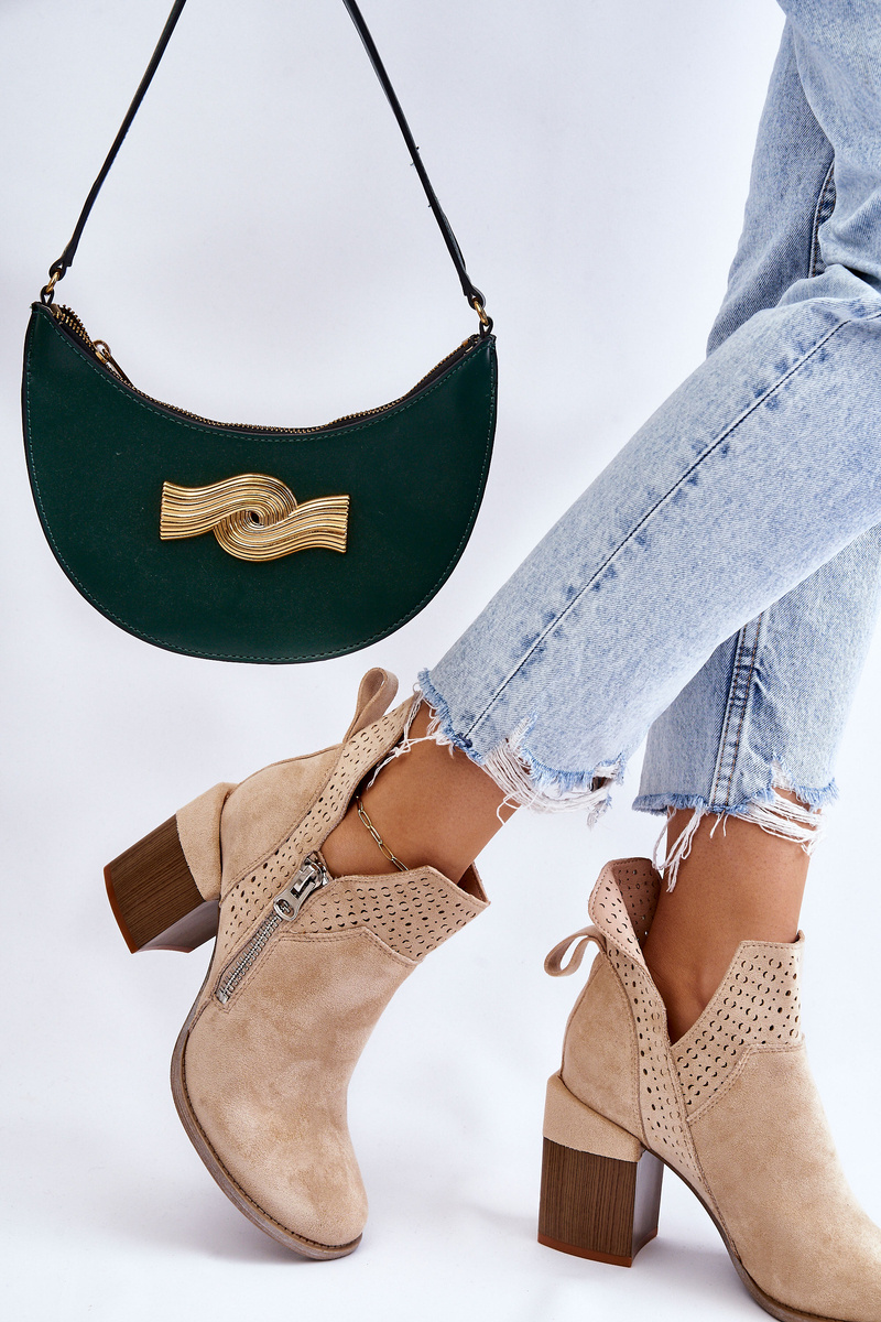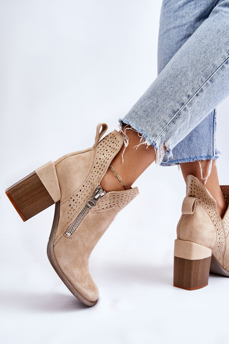Wiosenne botki stanowią świetne dopełnienie zarówno eleganckich, jak i sportowych stylizacji. Możesz założyć je do dzianinowej sukienki, ale także do jeansów. Wyjątkowy model wzbogaci Twój wiosenny outfit! Wykonane z eko zamszu w ażurowy wzór. Dodatkowo posiadają suwak z boku cholewki. Osadzone na masywnym obcasie w postaci klocka. Wkładka została wykonana z eko skóry.