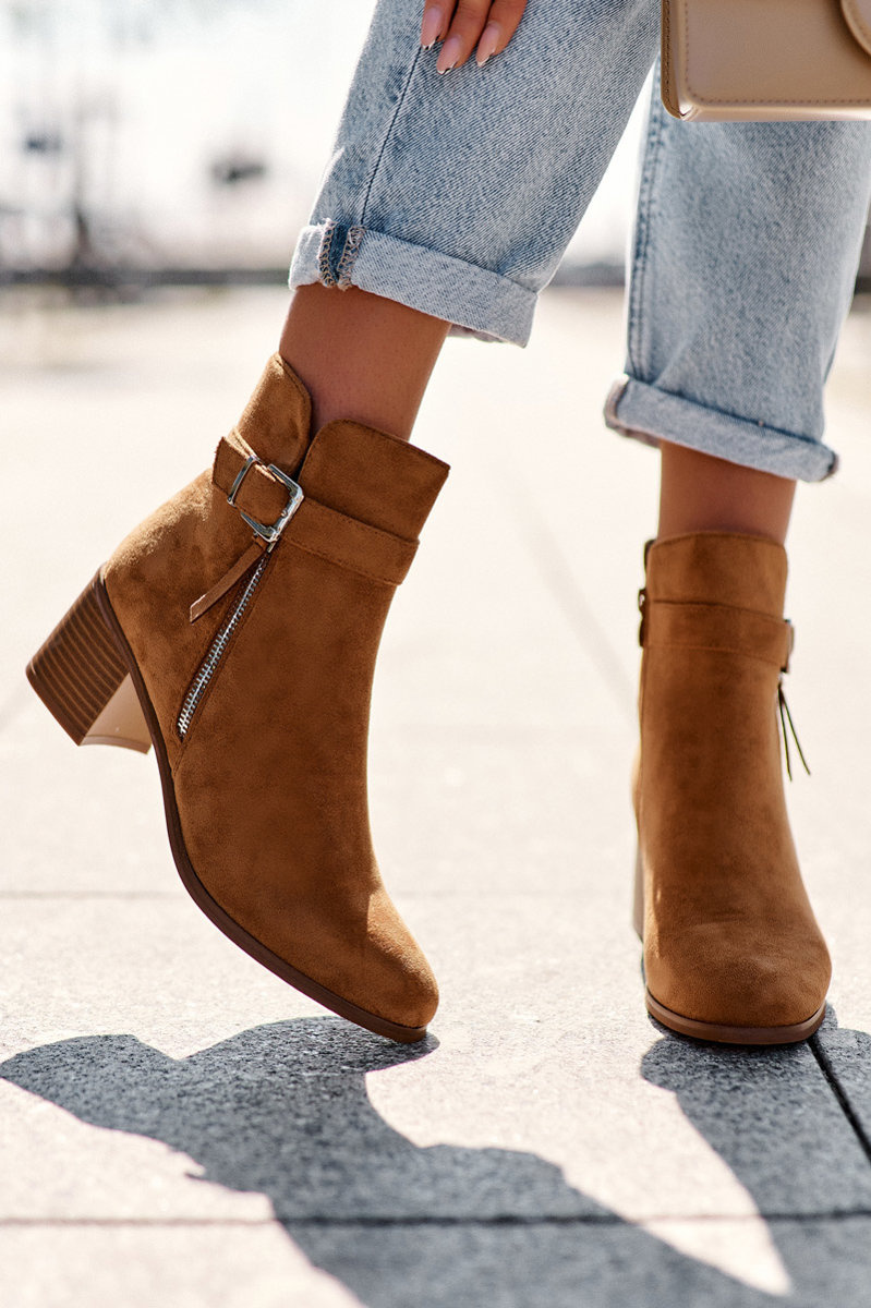 Jeśli tu trafiłaś, to znaczy, że cenisz sobie wyjątkowy styl! Botki na obcasie to buty, które można nosić niemalże do każdej stylizacji i jednocześnie zachwycać wyglądem. Wykonane z miłego w dotyku eko zamszu. Osadzone na niskim, stabilnym obcasie. Wnętrze ocieplone zostało kocem obuwniczym. Na cholewce znajduje się cienki paseczek z klamrą oraz dodatkowy suwak. Zapiętek jest usztywniony.