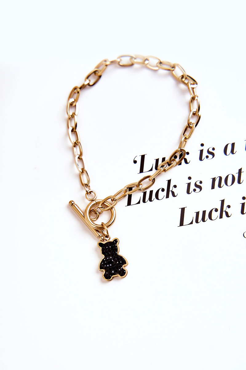 Biżuteria jest świetnym uzupełnieniem nie tylko tych elegancki, ale i codziennych stylizacji. Delikatne łańcuszki, bransoletki, broszki - idealnie podkreślą Twój styl. Koniecznie sprawdź naszą ofertę akcesoriów. Bransoletka na cienkim pasku ze stali nierdzewnej. Przyozdobiona misiem z dżetami imitującymi cyrkonie. Nie regulowana. Koniecznie musisz ją mieć!