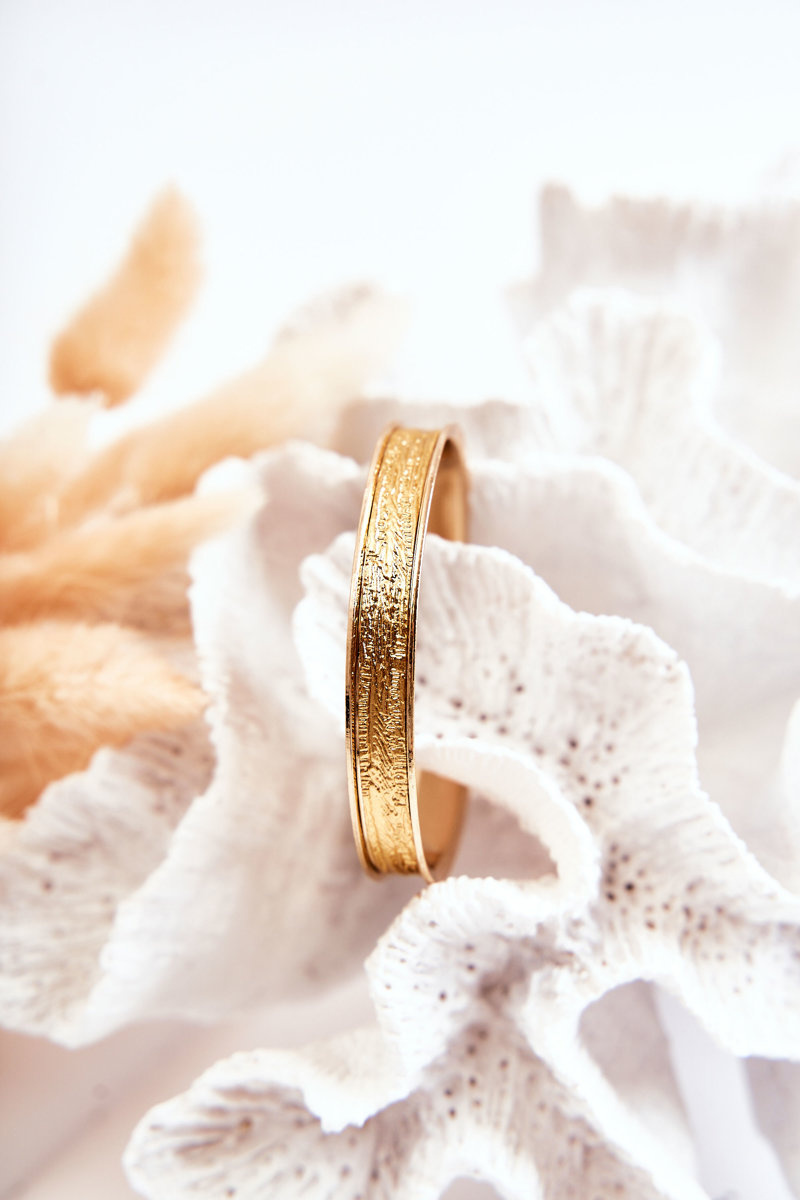Biżuteria jest świetnym uzupełnieniem nie tylko tych elegancki, ale i codziennych stylizacji. Delikatne łańcuszki, bransoletki, broszki - idealnie podkreślą Twój styl. Koniecznie sprawdź naszą ofertę akcesoriów. Bransoletka na szerszym pasku wykonana z metalu. Na całej długości bransoletki znajduje tłoczenie. Model wsuwany. Świetna jako dodatek do Twoich stylizacji. Koniecznie musisz ją mieć!