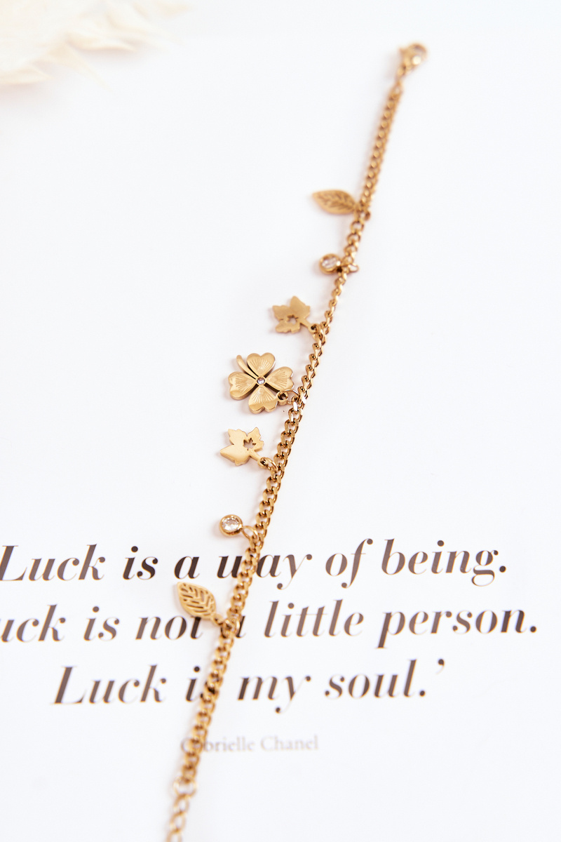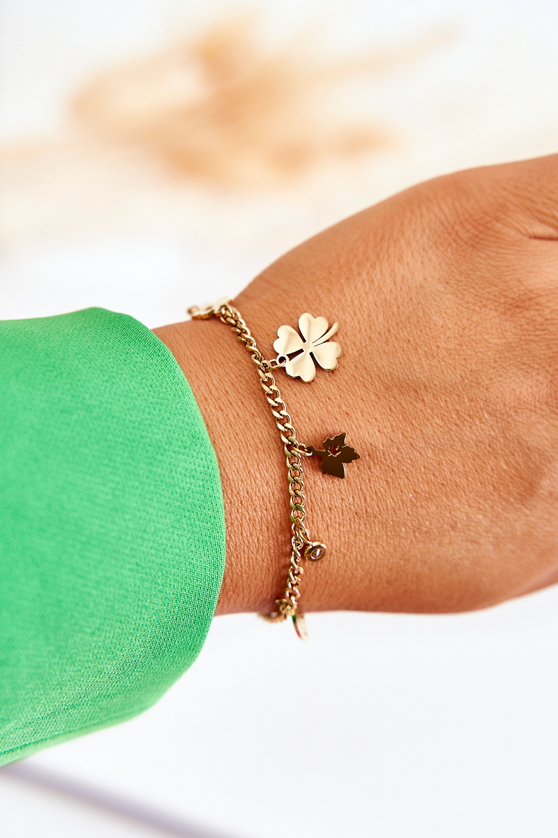 Biżuteria jest świetnym uzupełnieniem nie tylko tych elegancki, ale i codziennych stylizacji. Delikatne łańcuszki, bransoletki, broszki - idealnie podkreślą Twój styl. Koniecznie sprawdź naszą ofertę akcesoriów. Bransoletka ta została wykonana ze stali nierdzewnej. Posiada zawieszki w postaci liści, cyrkonii oraz koniczyny. Możliwość regulacji długości.