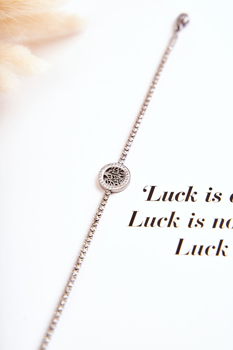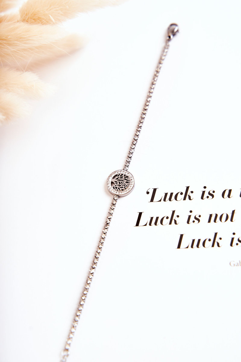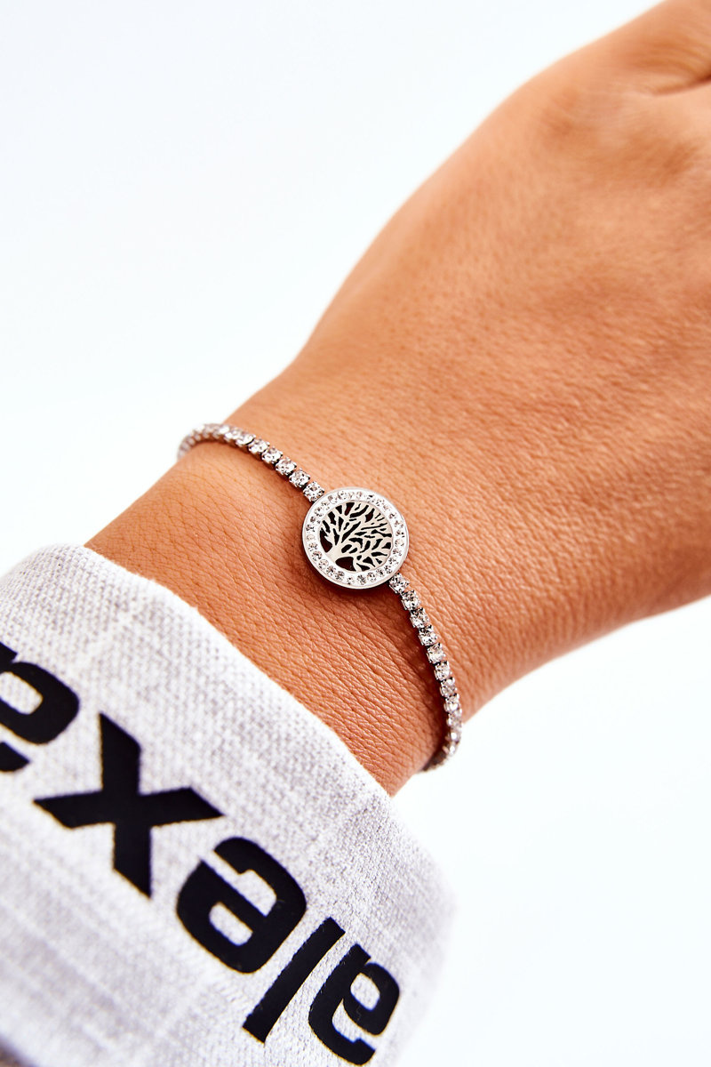 Biżuteria jest świetnym uzupełnieniem nie tylko tych elegancki, ale i codziennych stylizacji. Delikatne łańcuszki, bransoletki, broszki - idealnie podkreślą Twój styl. Koniecznie sprawdź naszą ofertę akcesoriów. Bransoletka na pojedynczym pasku ze stali nierdzewnej. Przyozdobiona kilkoma dżetami w postaci imitacji cyrkonii oraz drzewa w kole. Możliwość regulacji. Świetny model jako dodatek do Twoich stylizacji. Koniecznie musisz ją mieć!