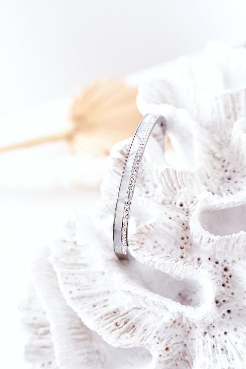 Bransoletka wykonana jest ze stali nierdzewnej, ozdobiona mieniącymi się cyrkoniami oraz kamieniem o perłowym wykończeniu.
