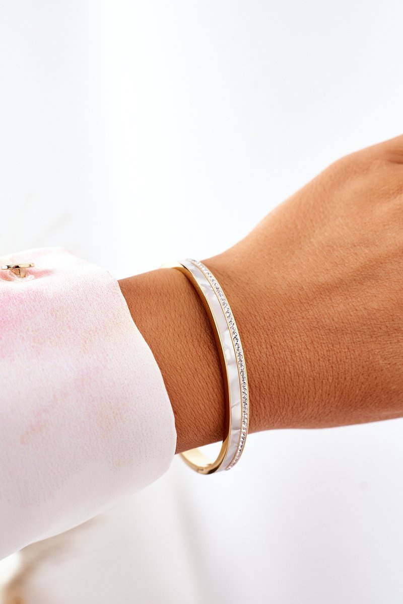 Bransoletka wykonana jest ze stali nierdzewnej, ozdobiona mieniącymi się cyrkoniami oraz kamieniem o perłowym wykończeniu.