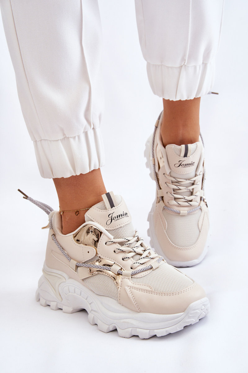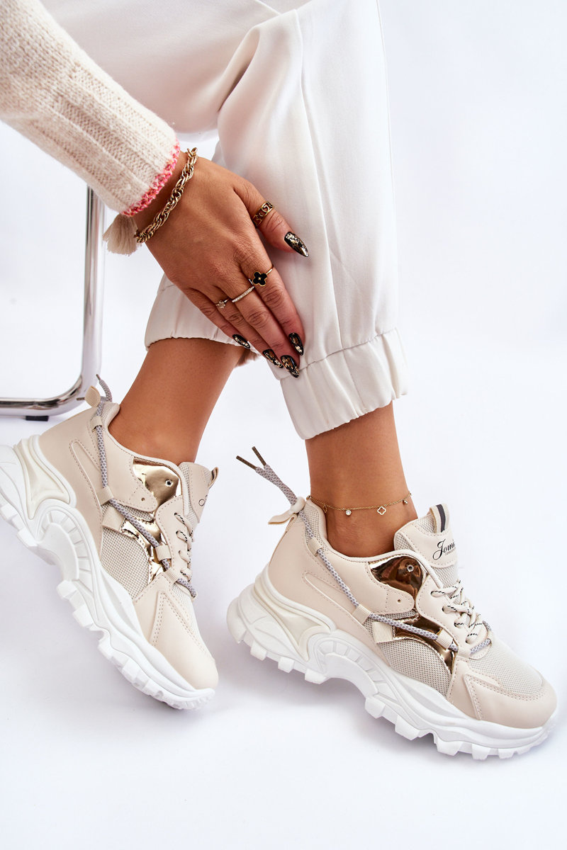 Buty Sportowe Damskie Sznurowane Platforma Beżowe Minea