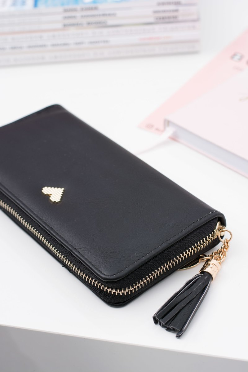 Czarny Damski Duży Portfel Brelok Złote Serce
