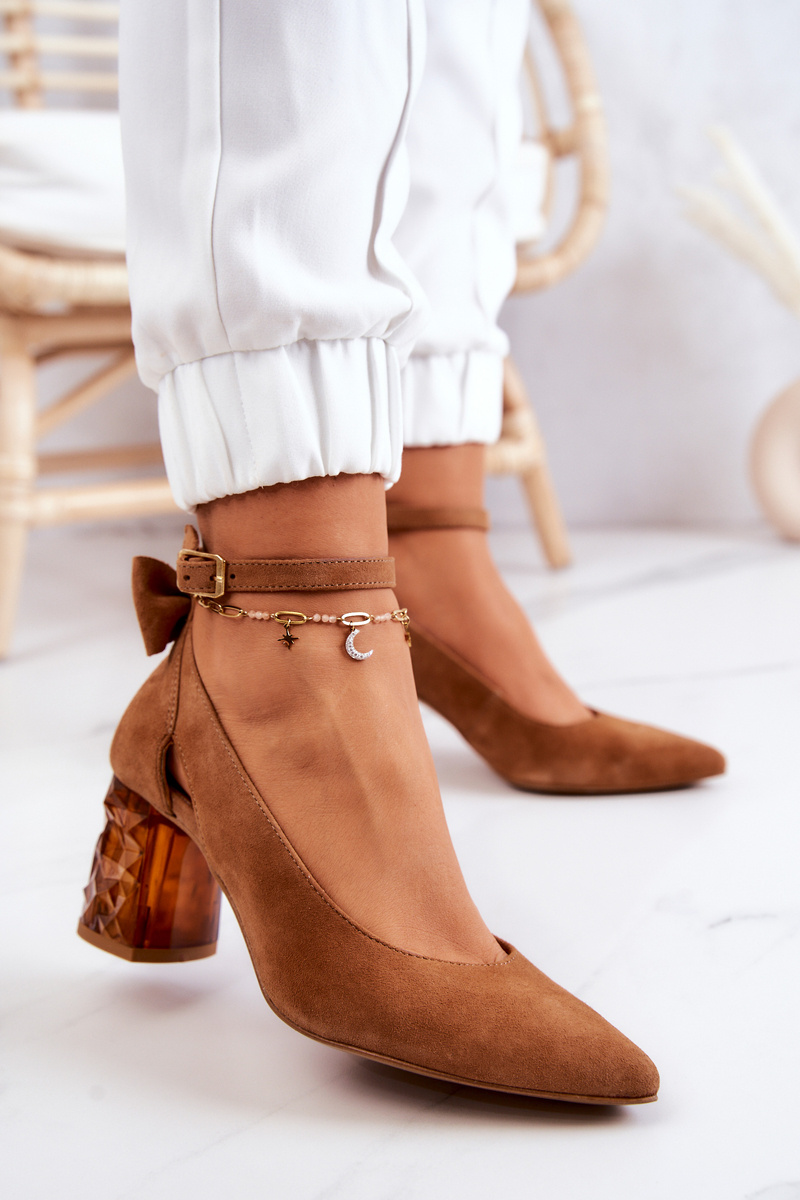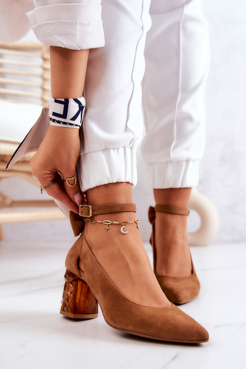 Klasyczne czółenka przydadzą się na różne okazje – do pracy, na rodzinne spotkanie czy na imprezę ze znajomymi. Taki fason powinien znaleźć się w każdej kobiecej szafie! Fantastycznie dopełnią każdą stylizację – zarówno w wersji z sukienkami, jak i jeansami. Wykonane z naturalnej, zamszowej skóry. Miękka wkładka zapewni komfort przez cały dzień. Stabilny obcas w postaci słupka. Urocza kokarda z tyłu cholewki nadaje tym butom elegancji. Zapinane na regulowany pasek ze sprzączką.
