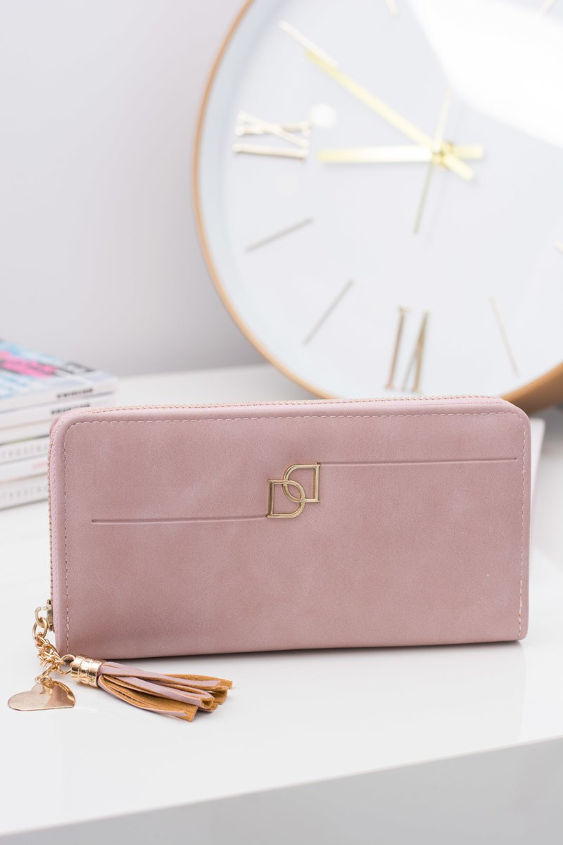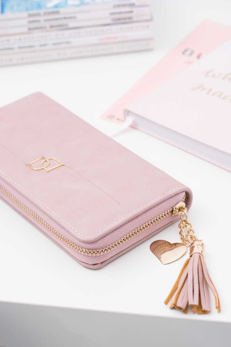 Damski Duży Portfel z Frędzlem Brelok Pudrowy Róż
