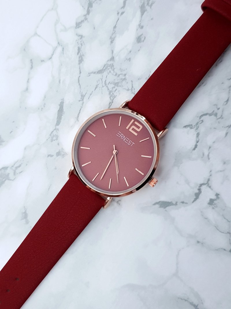 Damski zegarek Claire marki Ernest! Najnowszy model z piękną, szykowną kopertą oraz regulowanym paskiem. To idealny wybór dla eleganckich kobiet! Pasuje zarówno do codziennych stylizacji jak i tych bardziej eleganckich. Duża czytelna tarcza w kolorze paska. Nie czekaj dłużej, spraw sobie trochę elegancji w najwyższej jakości. Każdy zegarek zapakowany jest w ozdobne pudełko.