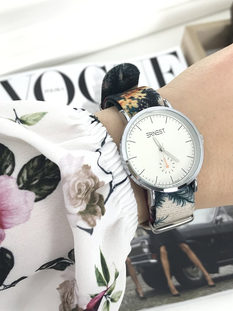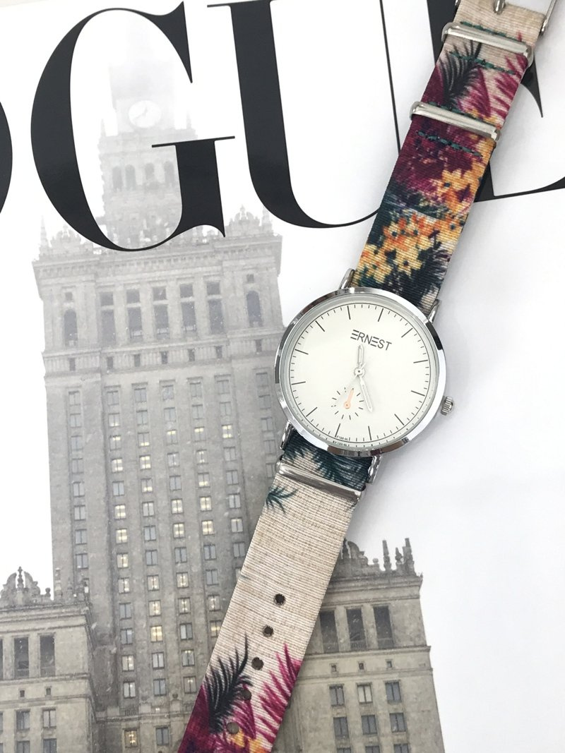 Ernest to światowa marka, ceniona przez kobiety na całym świecie. Model Flores to przepiękny zegarek stworzony z myślą o kobietach kochających gustowne dodatki do swoich stylizacji. Płaskie szkiełko, które w połączeniu z paskiem w kwieciste wzory nadaje mu niecodziennego wyglądu. Koperta wykonana ze stali chirurgicznej, pasek ma możliwość łatwej i szybkiej regulacji. Wysoka jakość wykonania mechanizmu i koperty.