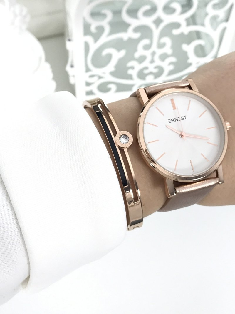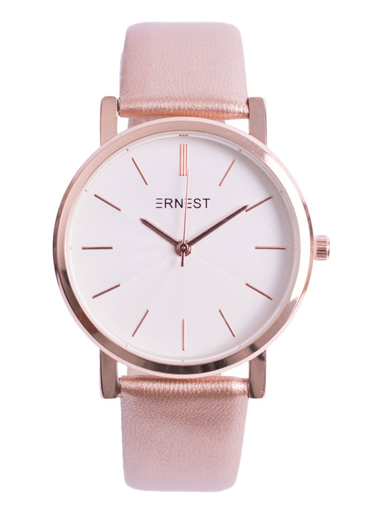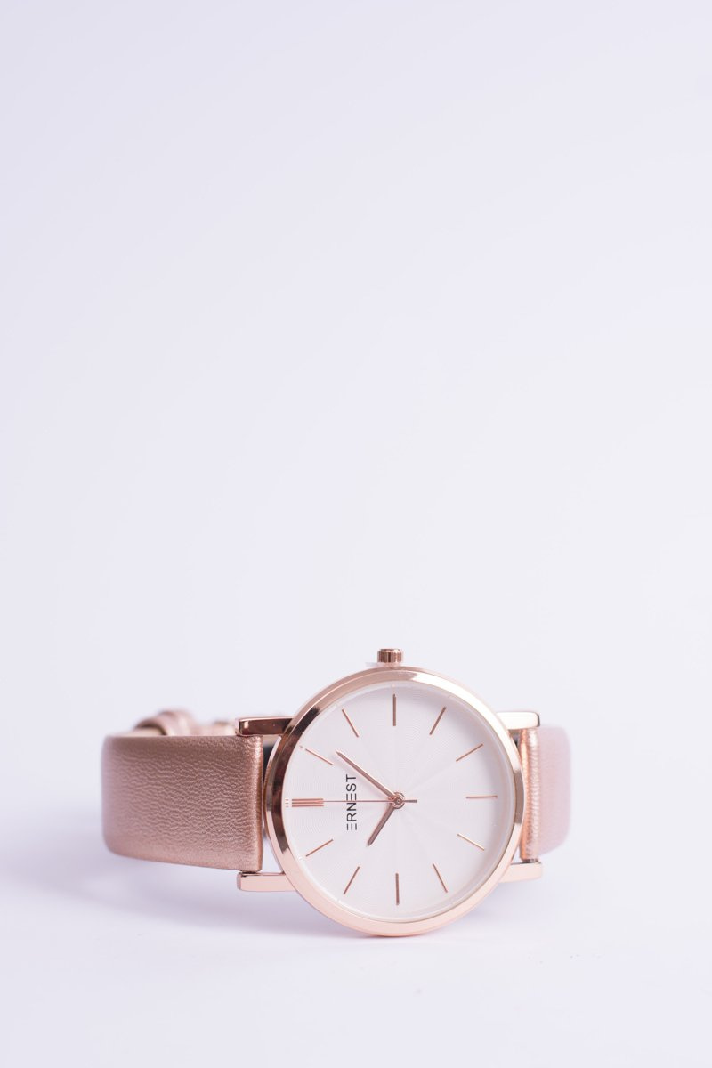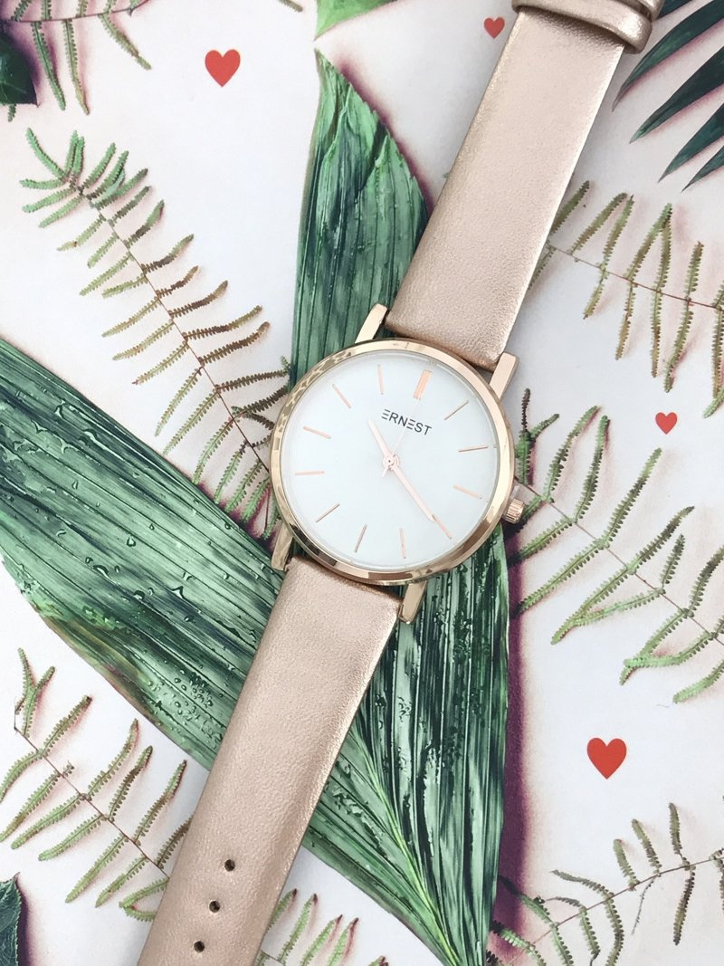 Zegarek Vega marki Ernest to gratka stworzona z myślą o kobietach kochających gustowne dodatki nie tylko do eleganckich ale również do codziennych stylizacji. Zegarek posiada płaskie szkiełko, dzięki temu jeszcze lepiej prezentuje się na ręce a jednocześnie jest bardziej czytelny. Delikatny pasek wykonany ze skóry ekologicznej z możliwością regulacji na dziurkach, złota koperta wykonana ze stali chirurgicznej. Wysoka jakość wykonania mechanizmu i koperty.