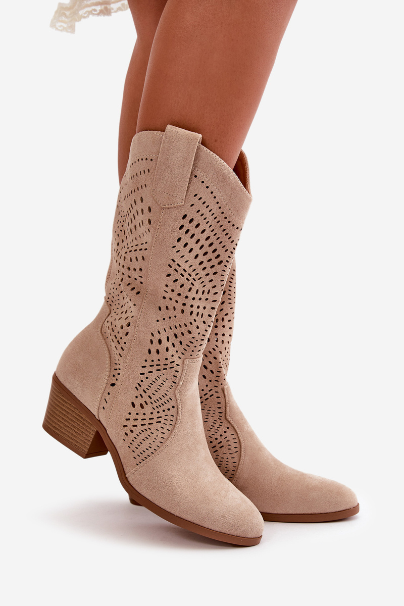 Damskie Ażurowe Botki Kowbojki Na Obcasie Beżowe Iceda