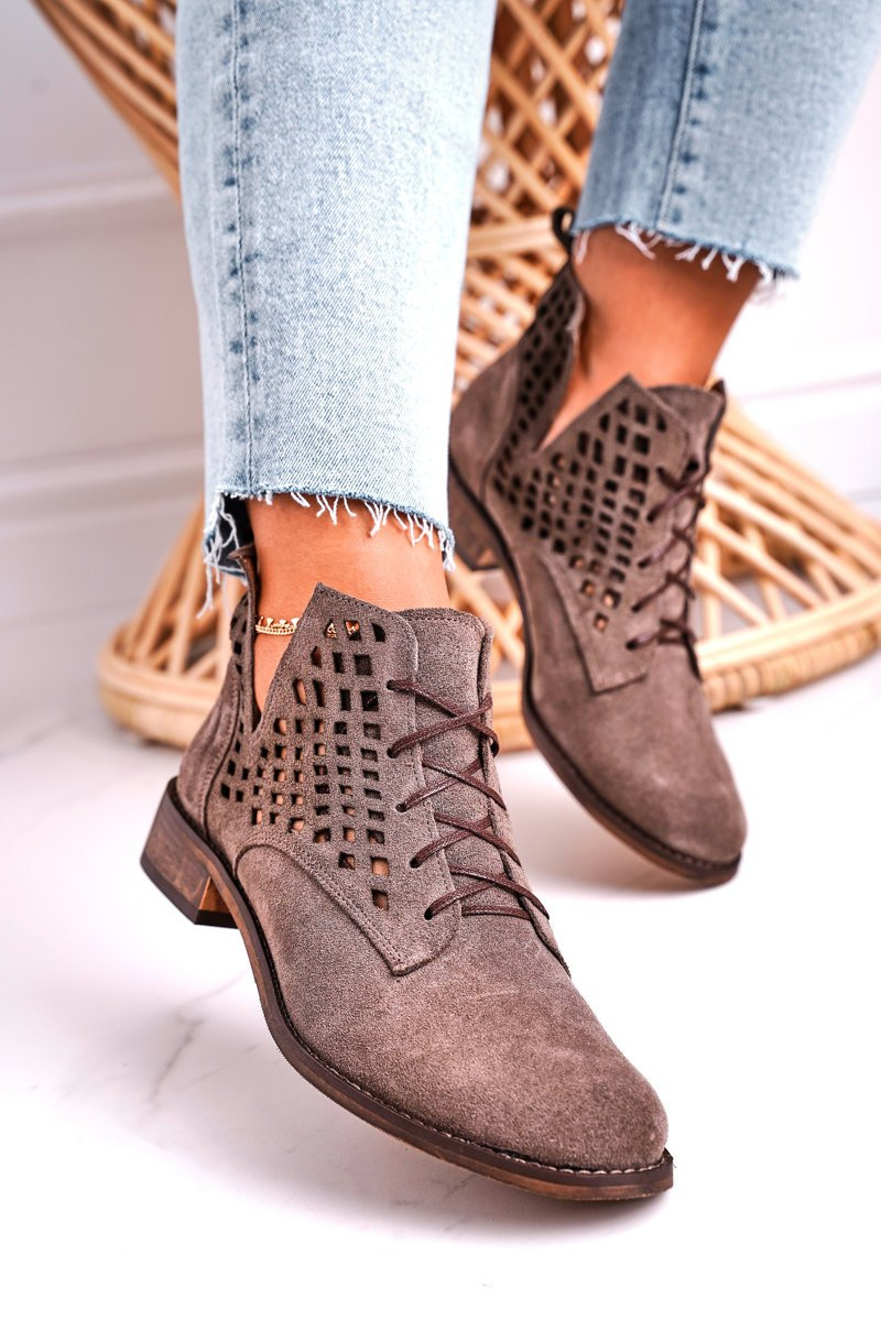 Damskie Ażurowe Botki Zamszowe Brązowe Susannah