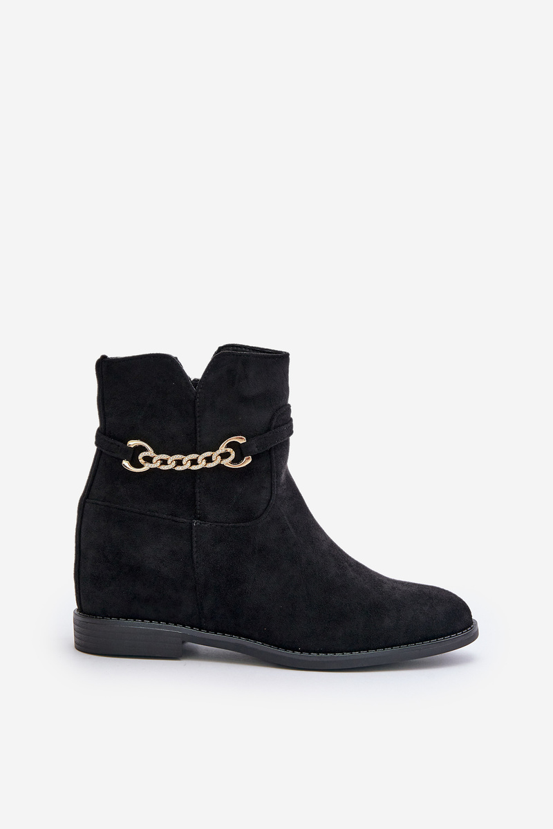 Modne botki na obcasie w postaci koturnu. Model ten zapewni wygodę i stabilność na każdym kroku. Modny fason, który powinien znaleźć się w Twojej szafie! Botki te zostały wykonane z eko zamszu. Zapinane na zamek. Osadzone na płaskim obcasie i ukrytym koturnie. Noski zaokrąglone. Usztywniony zapiętek. Cholewka ozdobiona paseczkiem ze złotym łańcuszkiem.