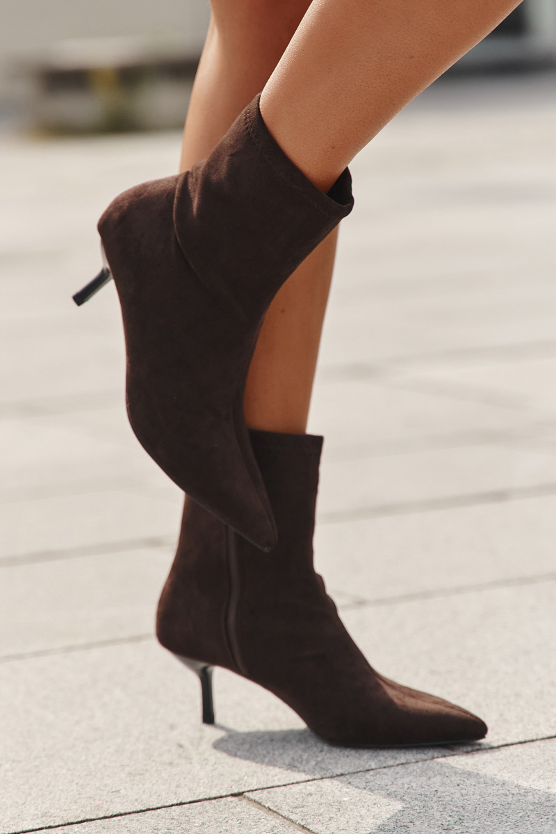 Damskie Botki Eko Zamszowe Obcas Szpilka Ocieplane Czekoladowe Belisse