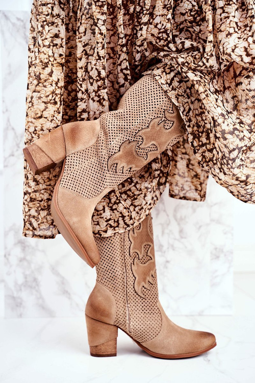 Damskie Botki Na Słupku Beżowe Skórzane Wysokie Rosemary