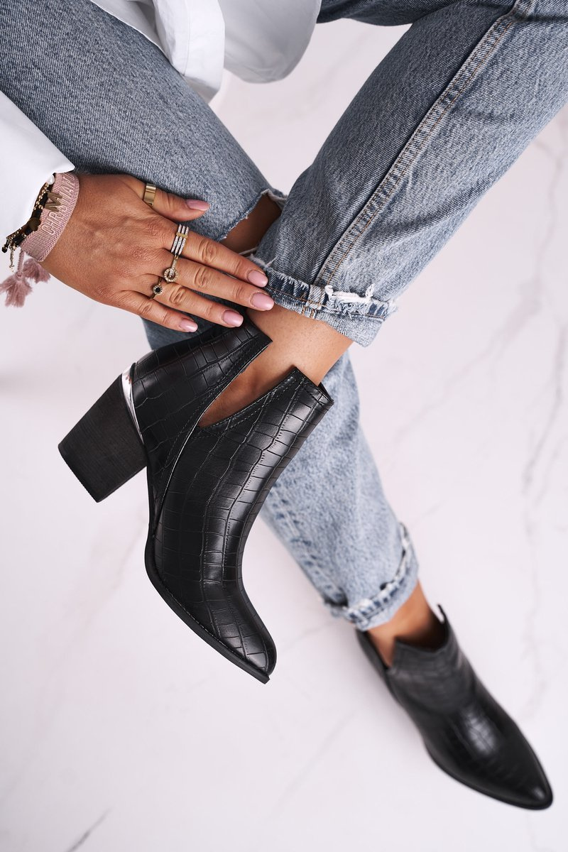 Czarne botki w klasycznej wersji z noskiem w szpic. Posiadają wcięcia na boku cholewki co ułatwi ich zakładanie. Osadzone na niewysokim słupku co podkreśli Twoją sywletkę. Przy wyborze rozmiaru prosimy sugerować się tabelą rozmiarów.