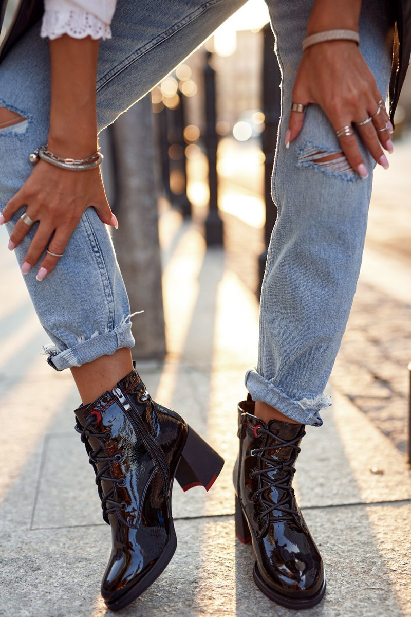 Marzyłaś o kolejnej parze butów, która zachwyci wszystkich dookoła? Jeśli tak to nie musisz już szukać dalej. Klasyczny krój na słupku nigdy nie wyjdzie z mody, a połączenie go z lakierowaną skórą ekologiczną to po prostu strzał w 10! Botki posiadają zamek błyskawiczny ułatwiający zakładanie oraz klasyczne sznurowanie dla jeszcze lepszego dopasowania. W chłodnie dni nie musisz się martwić co założyć, ponieważ botki wewnątrz posiadają delikatne ocieplenie w postaci koca obuwniczego. Przy wyborze rozmiaru prosimy sugerować się tabelą rozmiarów.