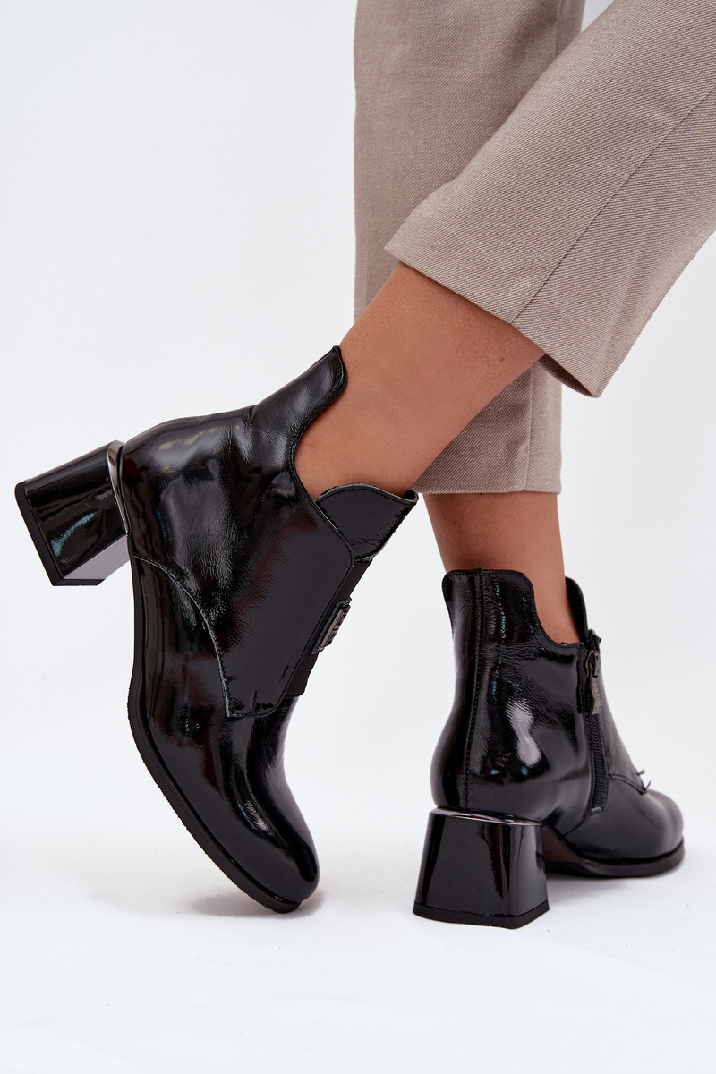 Damskie Botki Obcas Klocek Ocieplane Ozdobny Detal Skóra Czarne Zazoo 60560