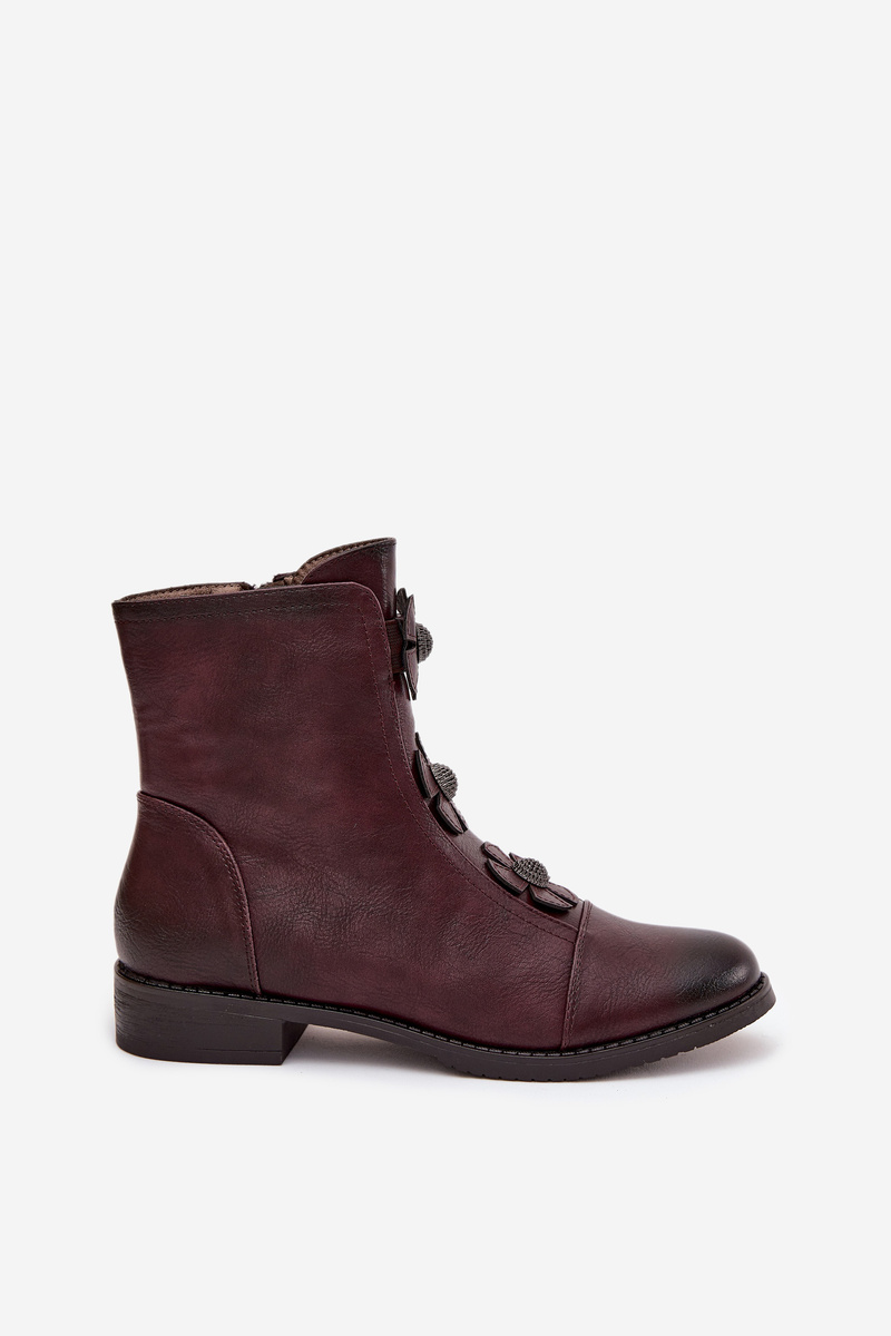 Damskie Botki Ocieplane Ozdobne Kwiatki Płaski Obcas Bordowe Pravienne