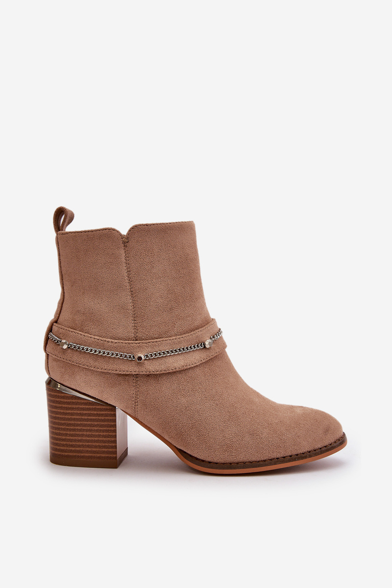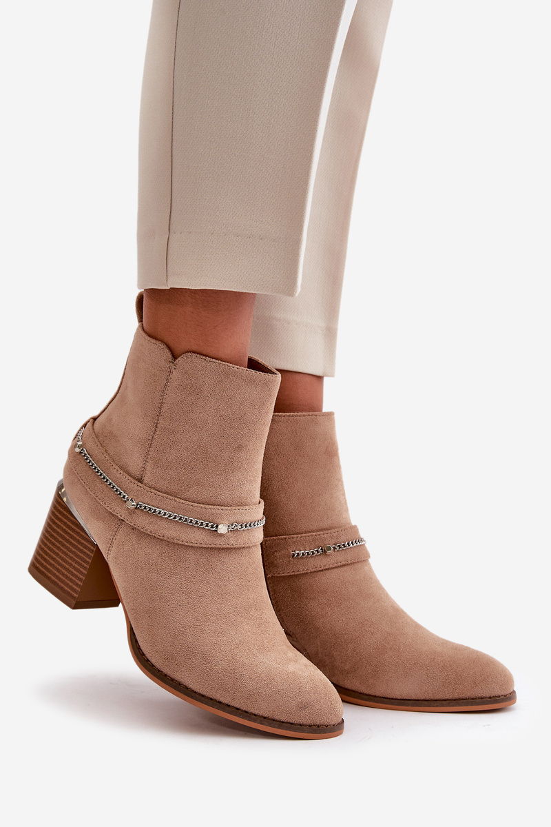 Damskie Botki Ocieplane Z Łańcuszkiem Obcas Słupek Eko Zamsz Beżowe Hanalen