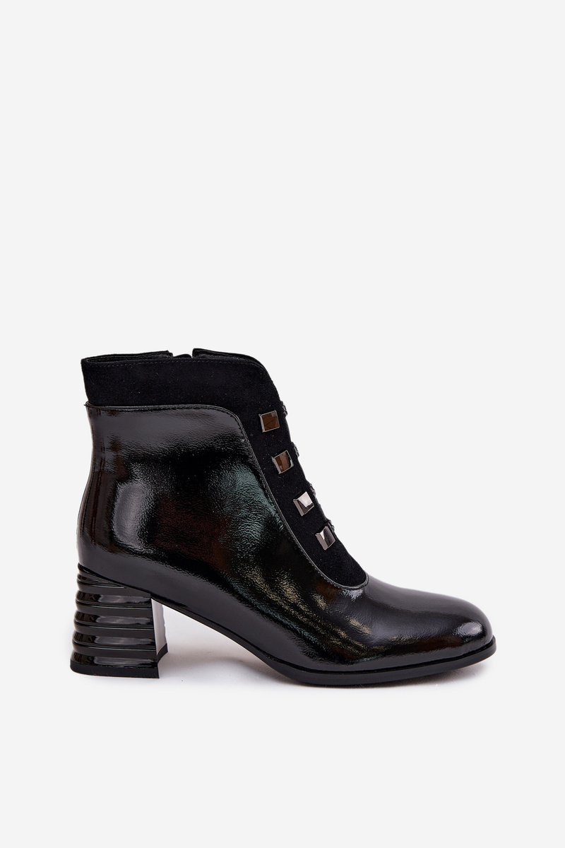 Damskie Botki Skóra Naturalna Obcas Słupek Lakierowane Czarne D&A MR52-144