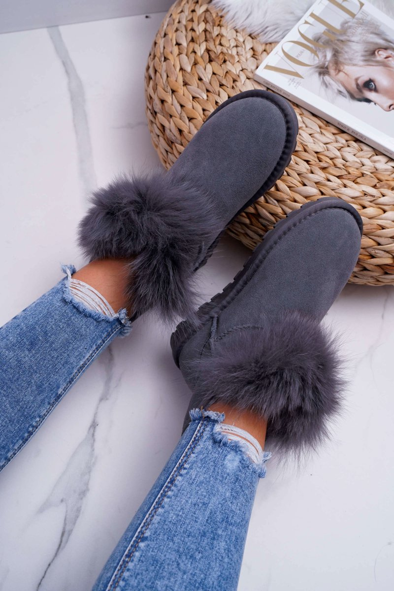 Damskie Botki Śniegowce Ocieplane Futerkiem Skóra Zamsz Szare Memento