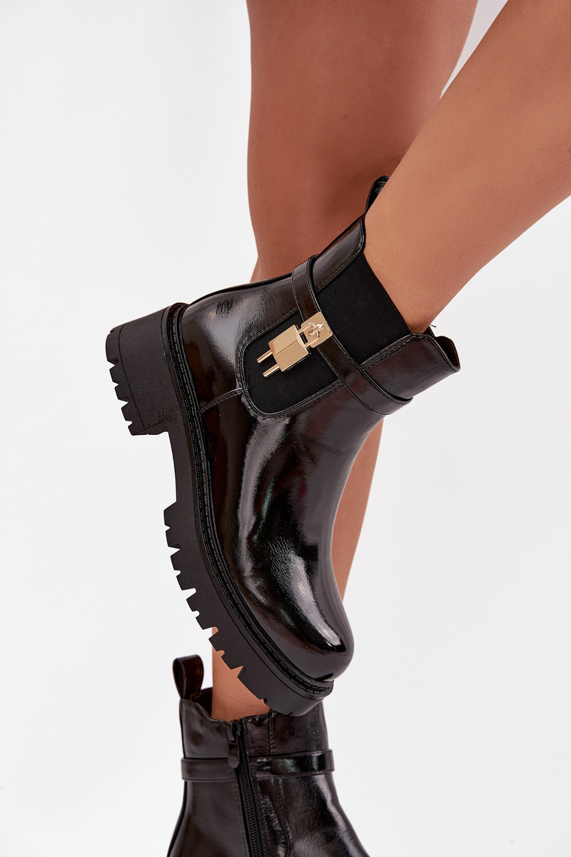 Damskie Botki Sztyblety Lakierowane Złoty Detal Zamek Czarne Talyra