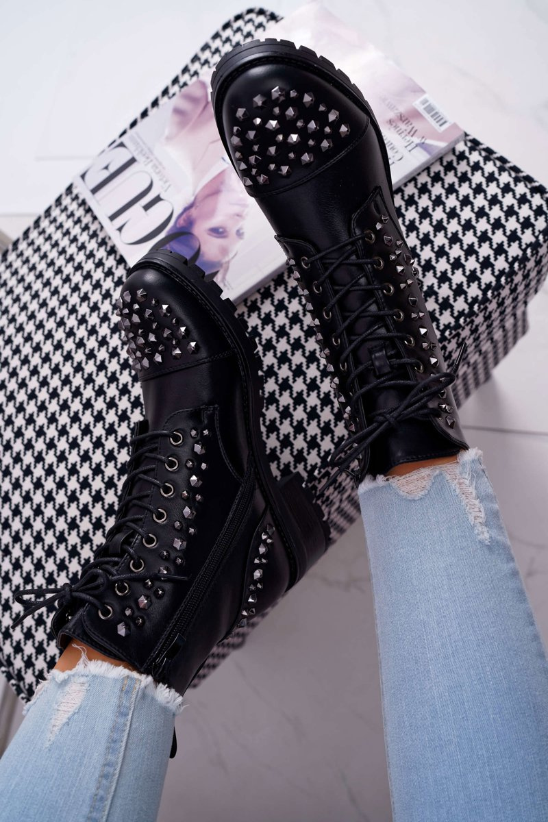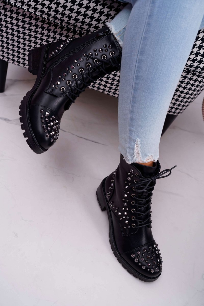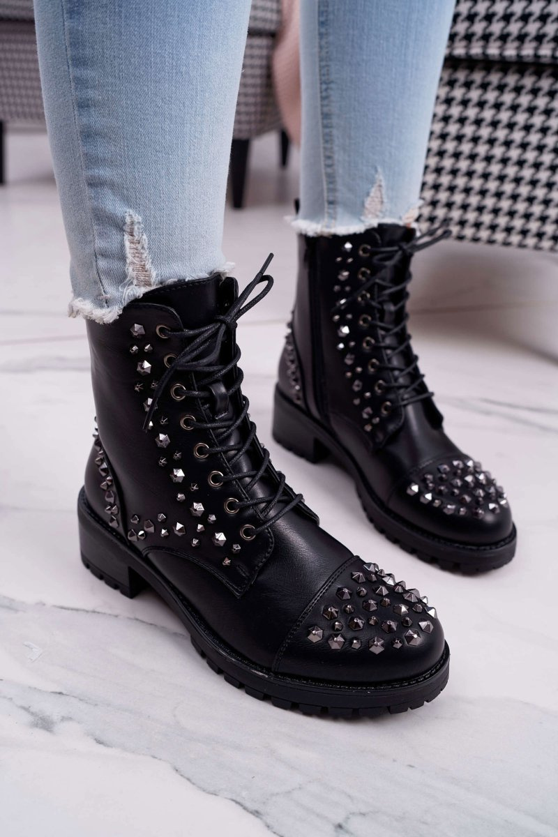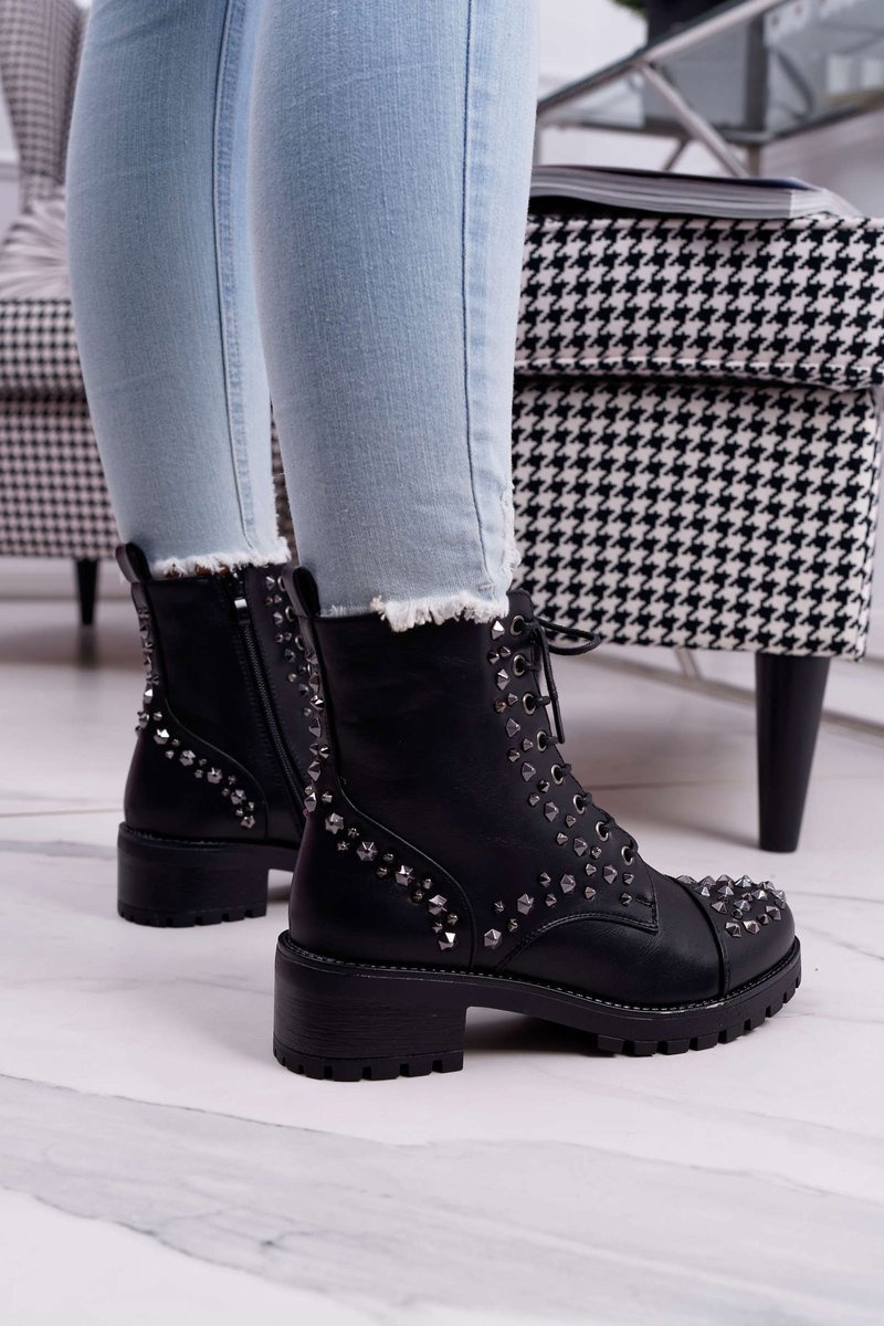 Damskie Botki Workery Z Dżetami Czarne Gether