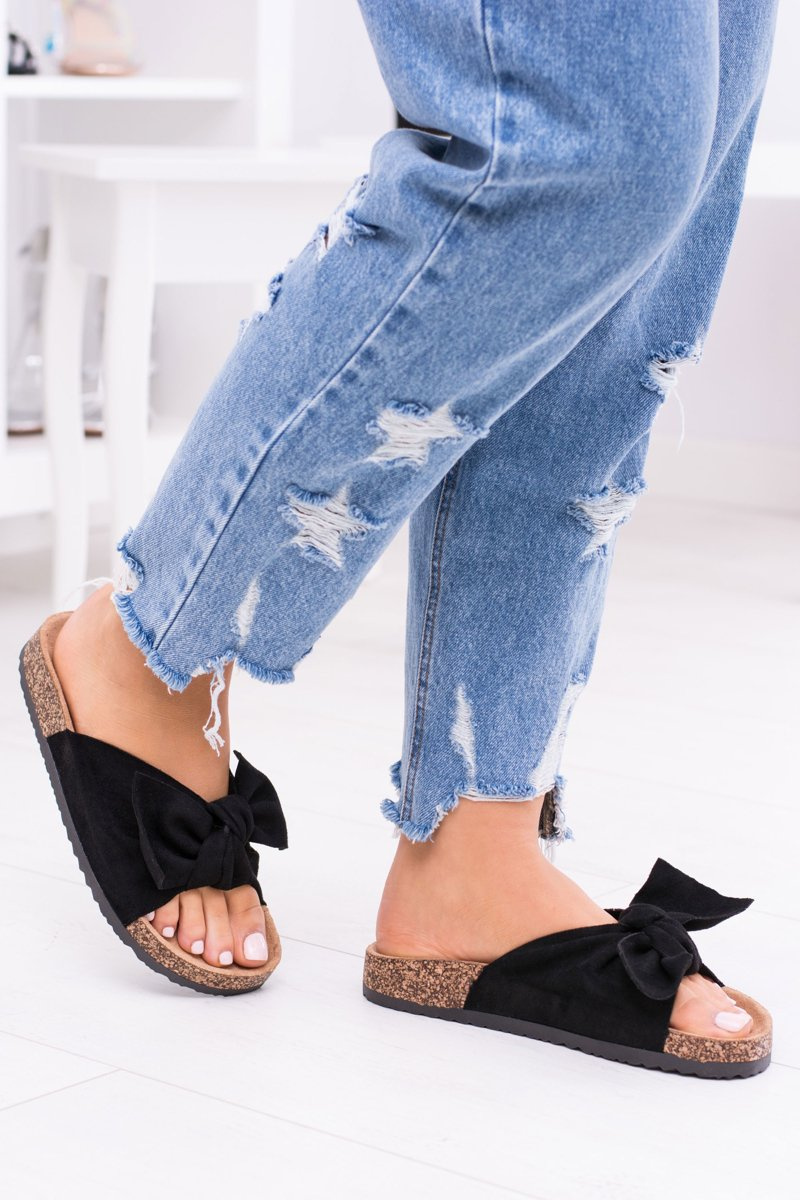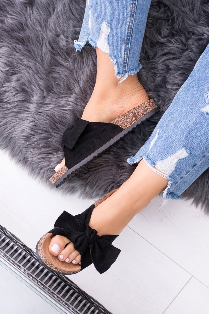 Damskie Czarne Klapki Na Korku Kokarda Dominica