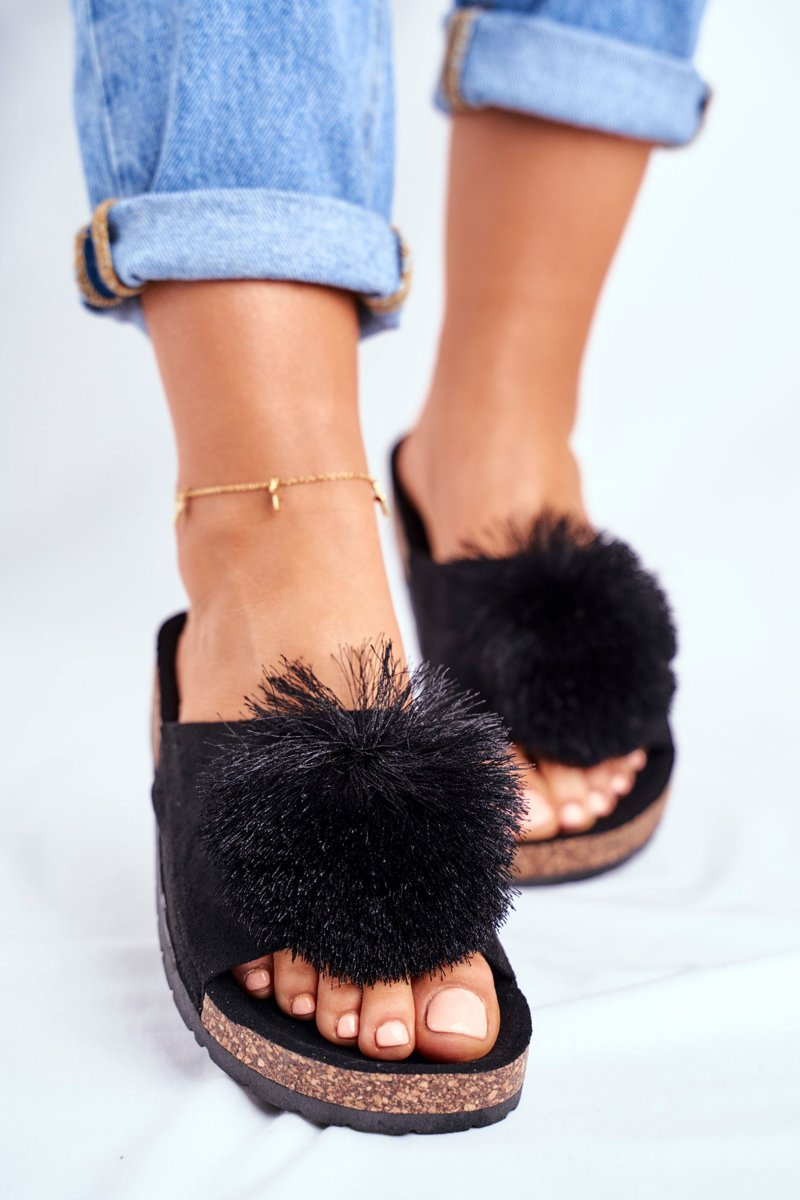 Damskie Czarne Klapki Na Korku z Pomponem Galaxo