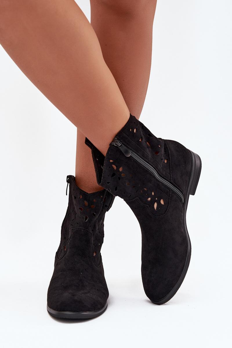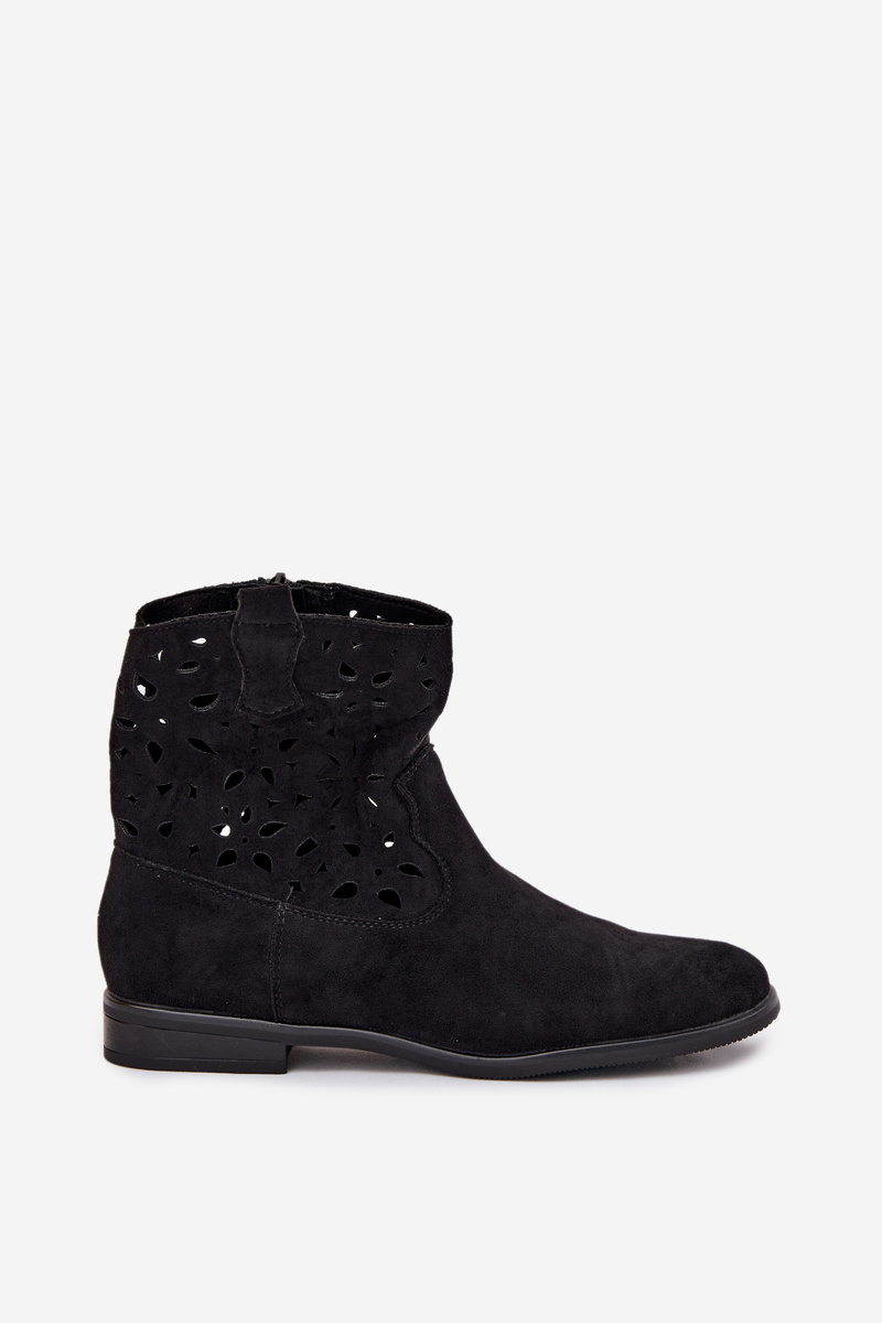 Damskie Eko Zamszowe Botki Na Płaskim Obcasie Ażurowe Czarne Athera