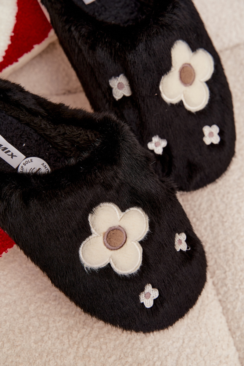 Damskie Kapcie Futrzane Z Kwiatkami Czarne Selinne