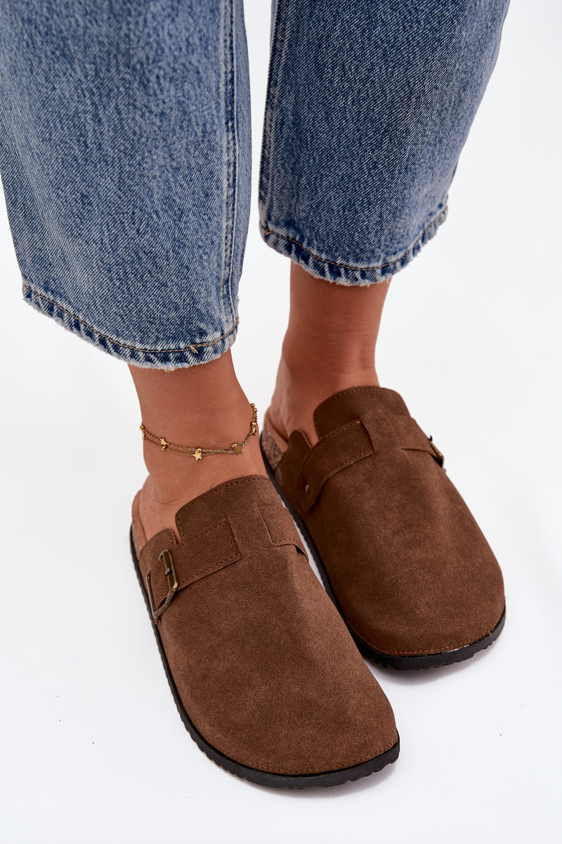 Damskie Klapki Chodaki Na Korkowej Platformie Z Klamrą Brązowe Selio