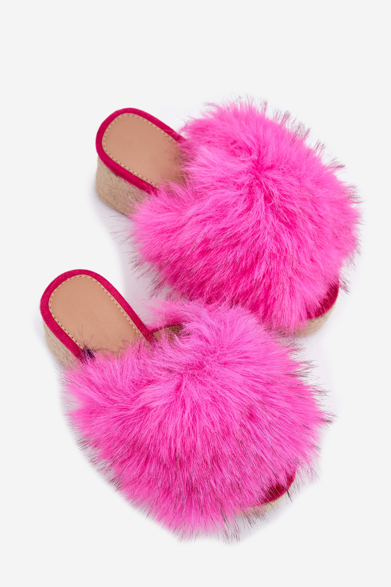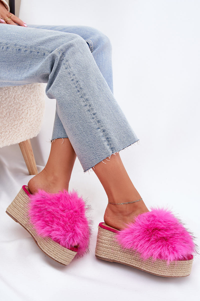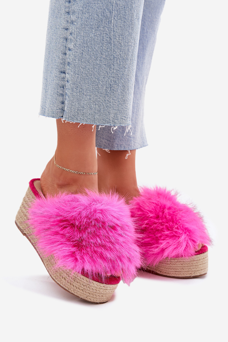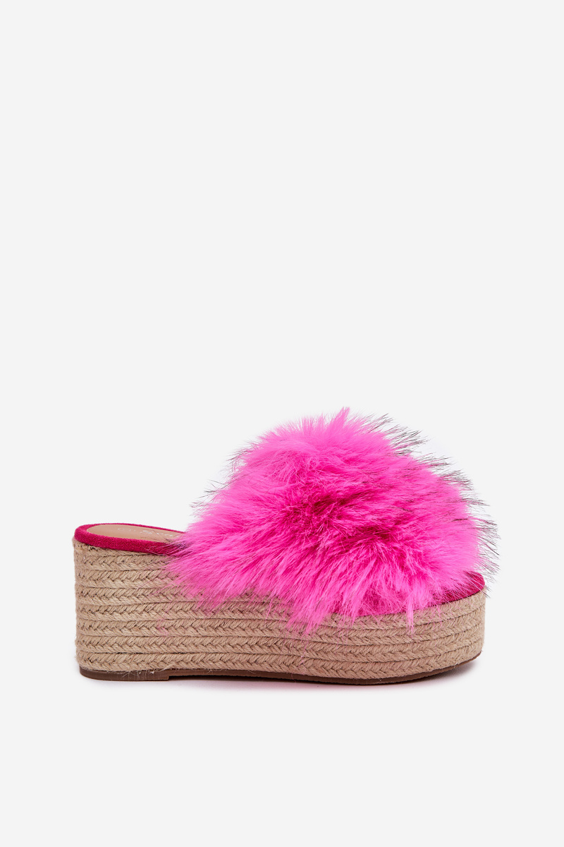 Damskie Klapki Futerko Koturn Plecionka Fuksja Virela