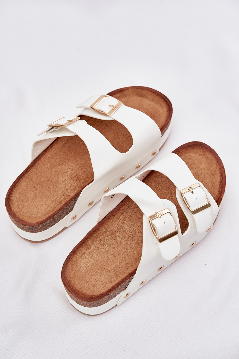 Klasyczne klapki o modnym fasonie pasują do wielu stylizacji! Idealne dla każdej kobiety ceniącej sobie komfort i wygodę na co dzień. Idealne na cieplejsze dni. Wykonane z eko skóry. Model ten wyróżnia masywna platforma oraz regulowane paski ze złotymi klamrami. Lekko profilowana wkładka zapewni komfort. Doskonałe do wielu letnich outfitów.