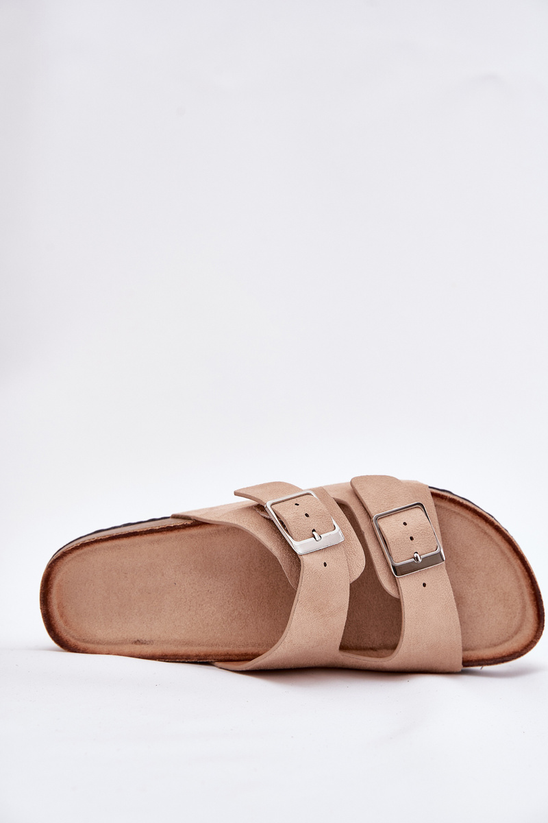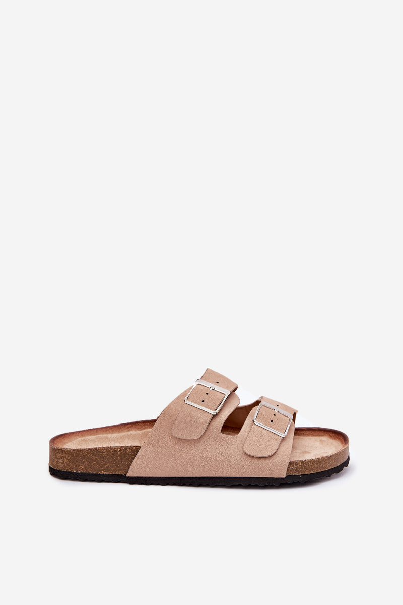 Klasyczne klapki o modnym fasonie pasują do wielu stylizacji! Idealne dla każdej kobiety ceniącej sobie komfort i wygodę na co dzień. Idealne na cieplejsze dni. Wykonane z eko zamszu. Osadzone na korkowej platformie. Model ten posiada dwa regulowane paski z klamrami, co pozwala na doskonałe dopasowanie do tęgości stopy. Profilowana wkładka zapewnia komfort przez cały dzień, a korkowa platforma dodaje lekkości i zapewnia stabilność. Idealne do codziennych stylizacji.