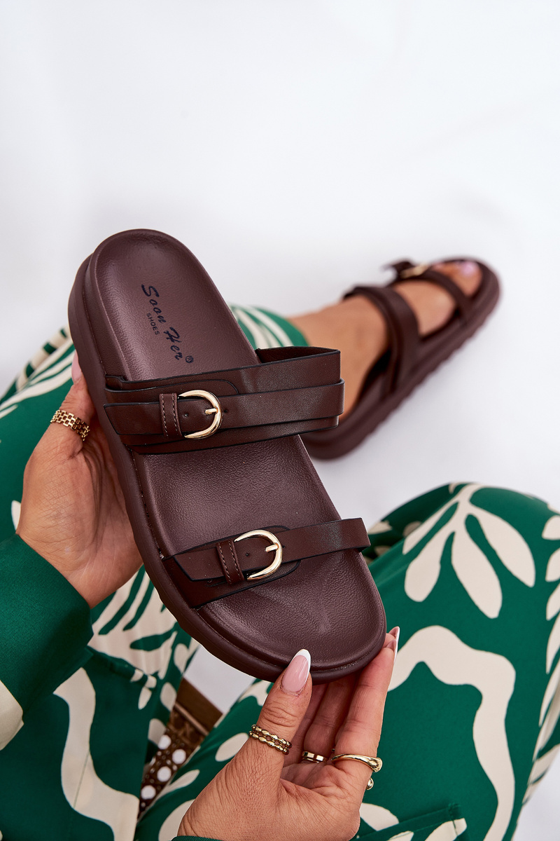 Damskie Klapki Na Platformie Z Paskami I Złotymi Klamrami Brązowe Wernone