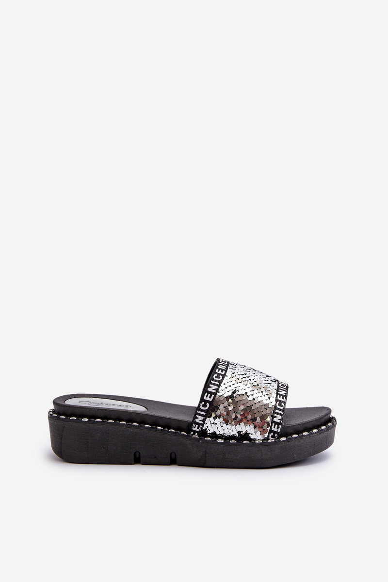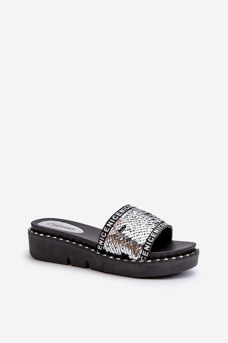 Damskie Klapki Ozdobione Cekinami Czarno-Srebrne Rivanique