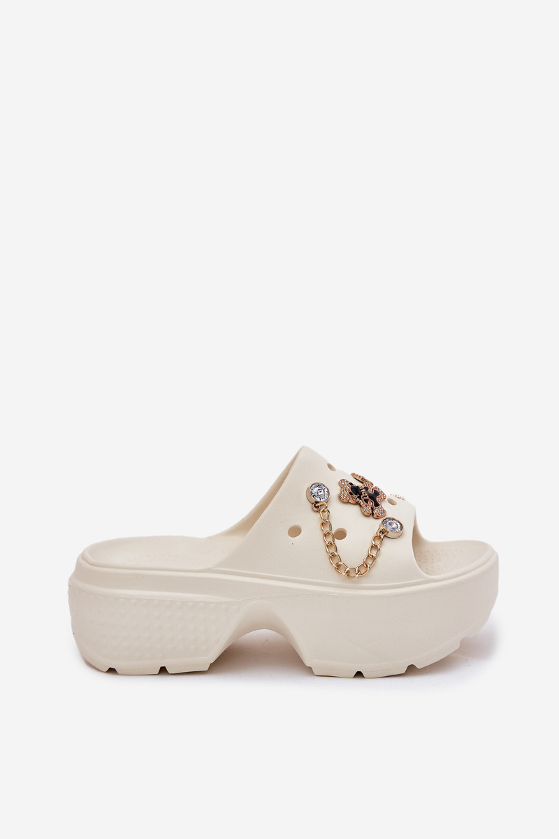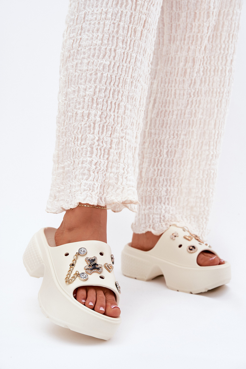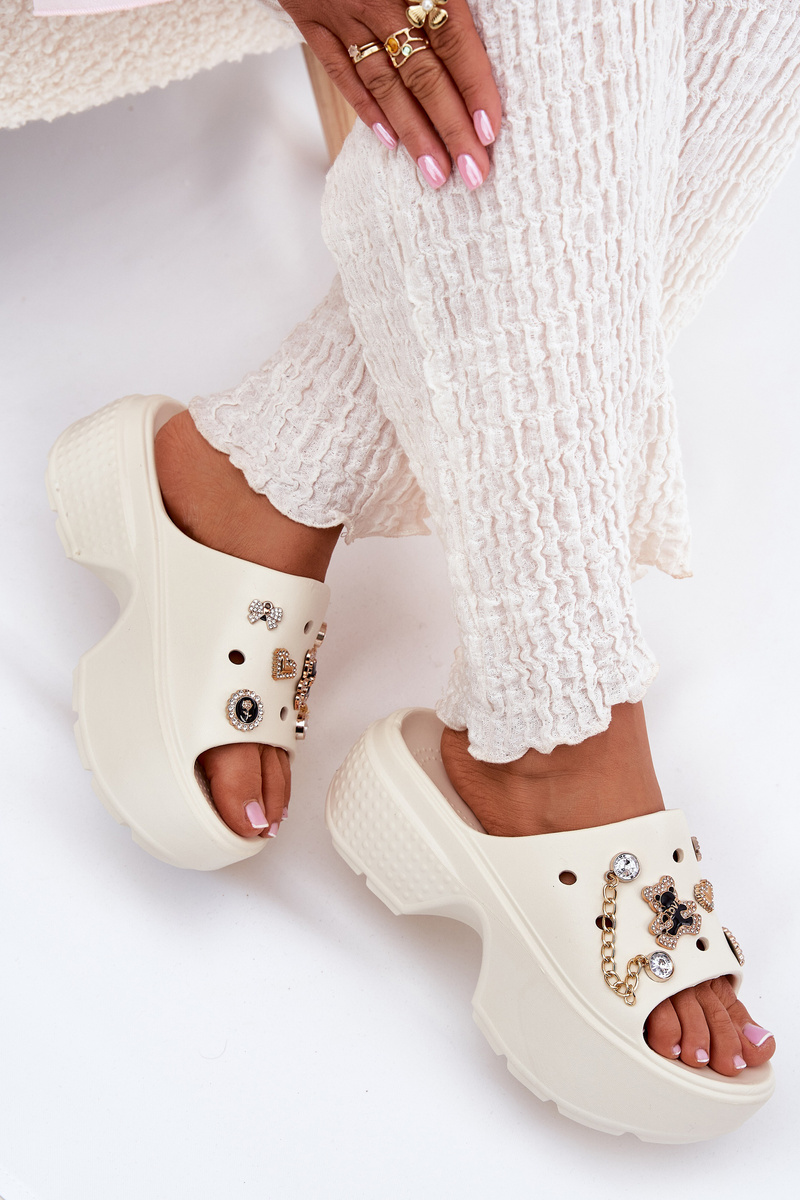 Damskie Klapki Piankowe Masywna Platforma Ecru Przypinki Czarne Ivoriel