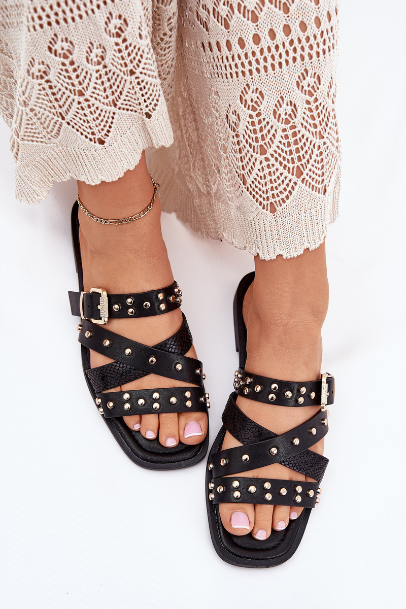 Damskie Klapki Płaski Obcas Zdobienie Paski Klamra Czarne Manitte